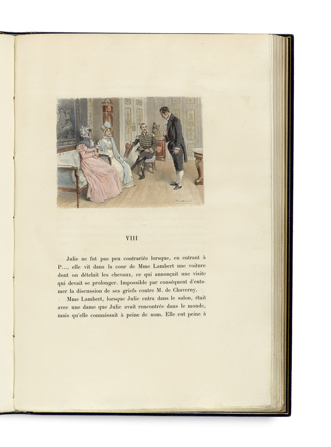 La Double Méprise. Blauer Chagrin Ledereinband mit goldgepr. RTitel, RVergoldung und goldgepr. DFileten und ornamentalem Rahmen sowie reicher Innenkantenvergoldung und Spiegel aus rosa Seide, signiert Chambolle-Duru. In HLdr. Schuber. Mit 19 farbigen Illustrationen nach Aquarellen von Bertrand. Paris, L. Conquer, 1902. 2 Bll., 116 S., 2 Bll. 4°. (Rücken sonnengebleicht, Schuber berieben).
