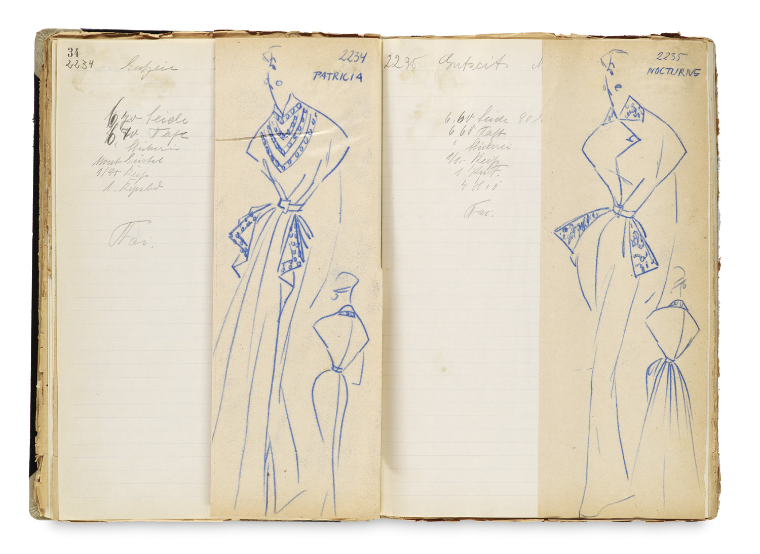 Modern Literature and Art – Fashion - Collection of over 450 drawings by the Berlin fashion house Gehriger & Glopp. Berlin, (late) 1950s. Each approx. 30 x 10.5 cm. Each mounted at the upper edge in three lined notebooks of the time with a D-label (slightly rubbed, canvas slightly soiled). 19 additional drawings (approx. 30 x 19 cm) with fabric samples and some with the fashion house's stamp on the reverse are enclosed loosely. - Gehringer & Glupp was one of four major fashion houses that opened on Kurfürstendamm in 1950. - Contains sketches primarily for coats and dresses. - Mostly with handwritten notes on the client's name (Albers, Engel, Maeding, Mucha, Pefestorff, Schlenker, Strebe, Zick, etc.), the model name, or a reference to the upcoming event, as well as information on the required materials (wool, silk, jersey, taffeta, grosgrain ribbon, etc.). - Somewhat stained, creased, and with marginal tears, overall good condition. - In add.: Catalogue with list of the collection and photographic portrait of Gehringer. 6 sheets. - Hans Gehringer. Small illustrated Christmas card signed H.G. to the house model Lucie Ezzat. - Gehringer's business card with address of the fashion house and original get well wishes. - Ibid. Original postcard from a spa in Bad Harzburg to the fashion house. 1957. - Gehringer's obituary. 1957. - Photo of Lucie Ezzat with her husband. Silver gelatin print. - Original greeting card to Lucie Ezzat. With 2 pencil drawings (1 loose). 1954.