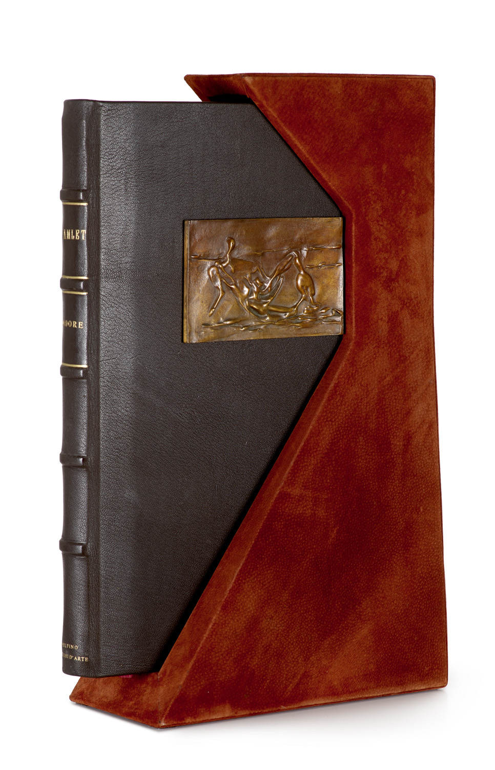 Modern Literature and Art – With 10 large-format offset lithographs signed in the plate after drawings by Henry Moore. Brown marocco leather with integrated bas-relief in a decorative slipcase. (Minimally rubbed at the edges). Numbered edition of 1200 copies, but it can be assumed that far fewer works are in circulation, as production was discontinued prematurely for cost reasons. Splendid edition of Hamlet on firm laid paper with the beautiful artwork of Henry Moore. - Well preserved. Splendid impression on strong laid paper. - A rectangular bronze relief entitled "Hamlet's Dilemma" by Moore is mounted on the front cover, a variation on an existing relief.