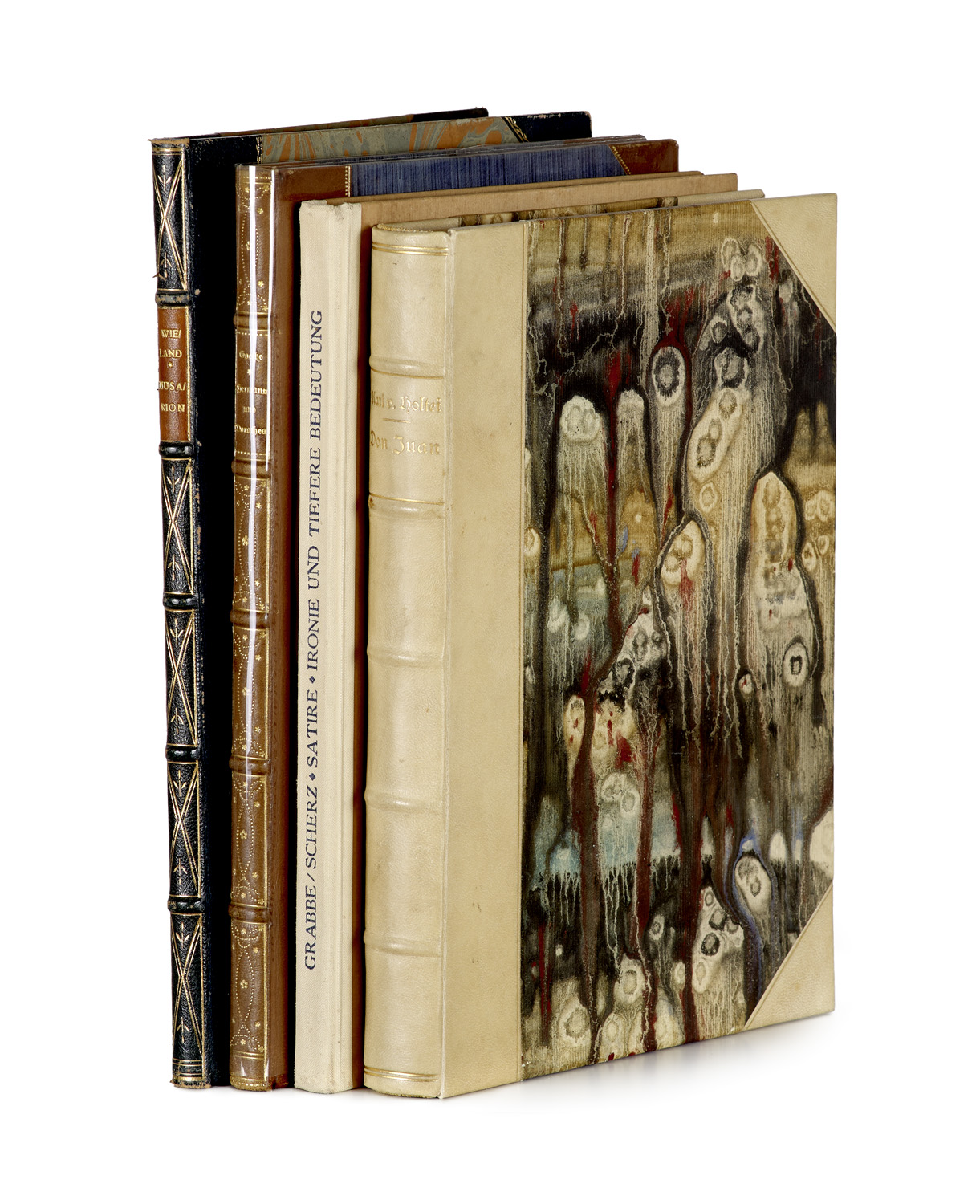 Moderne Literatur und Kunst – Enthält: 13. Druck: Grabbe, C.D., Scherz, Satire, Ironie. Mit 12 ORad. von F. Heubner. OHPgt. (etw. gebräunt). 1925. - 250 Expl. - 10. Druck: Goethe, Hermann und Dorothea. Lithos von W. Schmidt. OHLdr. (leicht berieben). 340 Expl. - 9. Druck: Wieland, Musarion. Mit 3 ORad. OHLdr. (leicht berieben). 340 Expl. - Dabei: Officina Serpentis: K. v. Holtei, Don Juan.Mit 14 ORad. von F. Meseck. Berlin, 1923. OHPgt. 265 sign. Expl.