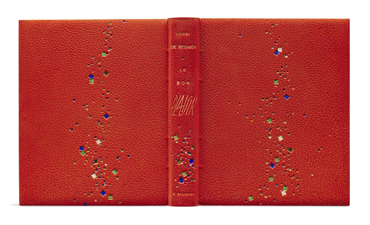 Modern Literature and Art – With 40 aquatint etchings in two states of printing (20 each), a colored title vignette, and 27 wood engravings in the text. Orange marocco with colorful sprinkle inlays and gilt stamped title and further sprinkle inserts. Marbled moiré endpapers with green inner edge fillets. Two-sided deckle edges with gilt edges. Original paper cover on Japan Bound in. In lined slipcase. Signed: Manuel Gérard. - One of 36 copies of the special edition, each with two states of printing. - Contains: Addendum with subscription prospectus, including two etchings. - The French artist Édouard Chimot designed 20 illustrations for this special edition of Henri de Regnier's novel, which are each included in the first and second state. While the first states were each printed with a remarque in the plate and left uncolored, the prints of the second state impress with their colorful coloration. The in total 41 aquatint etchings also include the first state of the title page. Sylvain Sauvage also produced 27 wood engravings, which were printed in brown ink. - The artfully crafted binding in bright orange with various colored sprinkle inlays was made by the French bookbinder Manuel Gérard. - Overall a very good copy with a splendid binding.