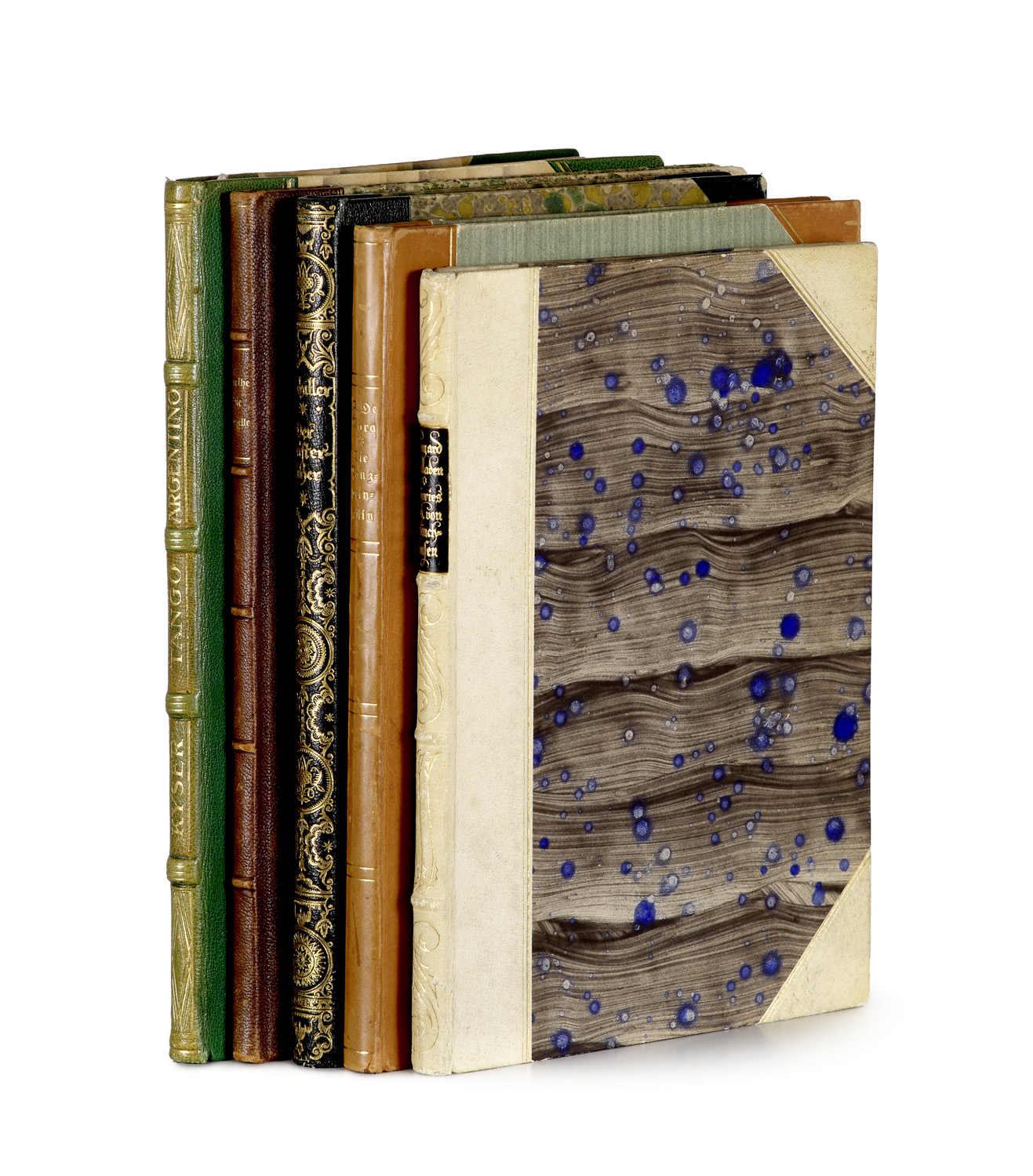 Moderne Literatur und Kunst – Enthält: H. Kyser, Tango Argentino. Mit 10 Rad. von E. Oppler. Berlin, 1925. 4°. OHLdr. (leicht berieben). 550 Expl. - Schiller, Der Geisterseher. Mit 10 Rad. von E. Oppler. Berlin, 1922 (2. Tilgner-Dr.). 4°. OHLdr. (leicht berieben). 350 Expl. - Münchhausen, Bayard. Mit 7 Rad. von A. Kolb. Berlin, 1922. Gr.-8°. OHPgt. 525 sign. Expl. - Goethe, Die Novelle. Mit 10 Steinzeichn. von C. Rabus. München, 1919 (hesperus-Dr.). Gr.-8°. OHLdr. - 500 sign. Expl. - A.- De Nora, Die Tanzprinzessin. Mit 12 ORad. von K.M. Schultheiß. Leipzig, 1922. Gr.-8°. OHLdr. (leicht berieben). 330 sign. Expl.