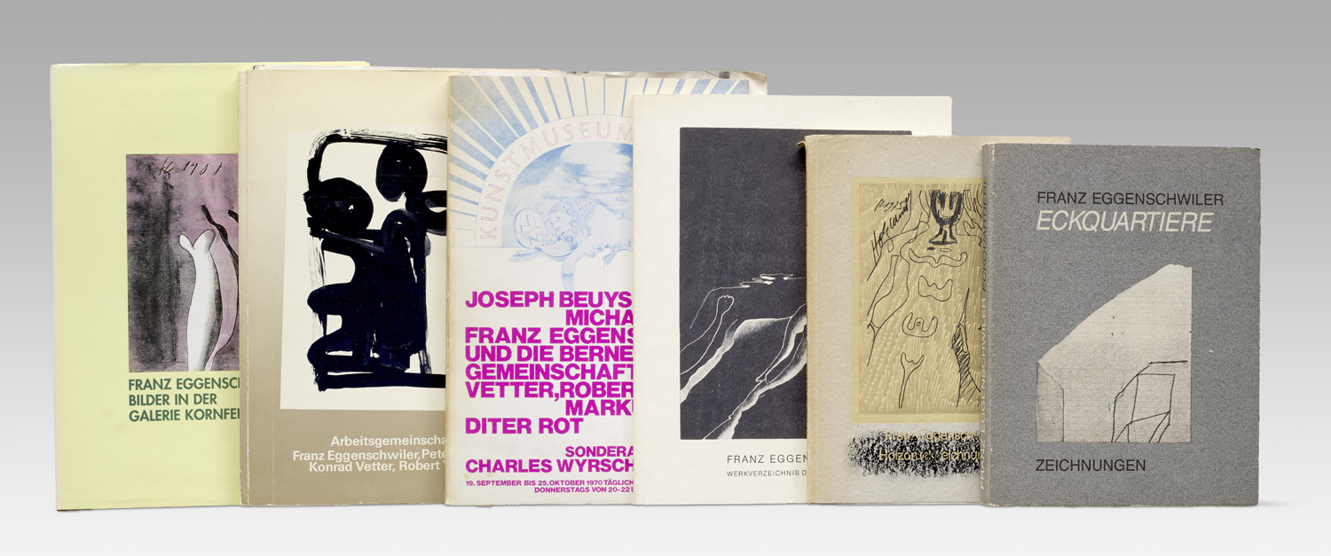 Moderne Literatur und Kunst – Enthält: Franz Eggenschwiler. Holzdruckzeichnungen und Holzdrucke. St. Gallen, Galerie E. & F. Buchmann, 1976. - Mit eigenhändiger Widmung von Franz Eggenschwiler an das Künstlerehepaar Martel und Gottfried Wiegand. - Franz Eggenschwiler. Werkverzeichnis der Holzdrucke. Reutlingen, Stadtverwaltung Reutlingen, 1986. - Eins von 800 Exemplaren. - Mit eigenhändiger Widmung an das Künstlerehepaar Martel und Gottfried Wiegand. - Franz Eggenschwiler. Eckquartiere. Zeichnungen. Selbstverlag zusammen mit Silvio Baviera, 1990. - Eins von 2000 Exemplaren. - Arbeitsgemeinschaft. Franz Eggenschwiler, Peter Maier, Konrad Vetter, Robert Wälti. Kunstmuseum Basel, 1971. - Franz Eggenschwiler. Bilder in der Galerie Kornfeld. Bern, Galerie Kornfeld, 1998. - Eins von 1000 Exemplaren. - Kunstmuseum Luzern. Jospeh Beuys, Michael Buthe, Franz Eggenschwiler, und die Berner Werk-Gemeinschaft (Konrad Vetter, Robert Waelti), Markus Raetz, Dieter Rot. Sonderausstellung Charles Wyrsch. 1970. - Dabei: Einige Broschüren. - Insgesamt gut erhalten.