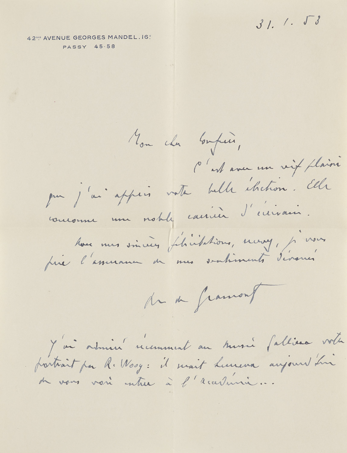 Autographs – Gramont, Armand Antoine, XIIth Duke of (1879-1962). Letter to Fernand Gregh with signature in envelope. Paris, 31 January 1953. 4°. 1 page. - The author congratulates the poet, literary critic and historian Fernand Gregh (1873-1960) on his admission to the Académie Française: 'Elle couronne une noble carrière d'écrivain.' (It crowns a noble career as a writer.) Gregh was an early companion of Marcel Proust and Henri Bergson. In addition to numerous volumes of poetry, he also wrote plays and several autobiographical works. In 1953, he was elected to the Académie as the successor to Charles de Chambrun. - The congratulator, Armand Antoine, 12th Duke of Gramont, was an industrialist and scientist. Among other things, he founded the camera manufacturer Optique & Précision de Levallois in 1919. - The envelope is stamped and has a postage stamp.