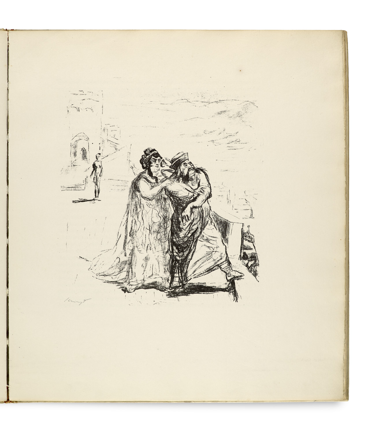 Herodias. Mit 6 signierten Original-Lithographien von Max Slevogt. Berlin, Reiss, (1919). 18 Bl. Folio. Original-Pergamentband mit goldgeprägtem Deckeltitel und Kopfgoldschnitt von Otto Dorfner (vorderer Deckel etwas fleckig und bestoßen, Deckel aufgebogen).