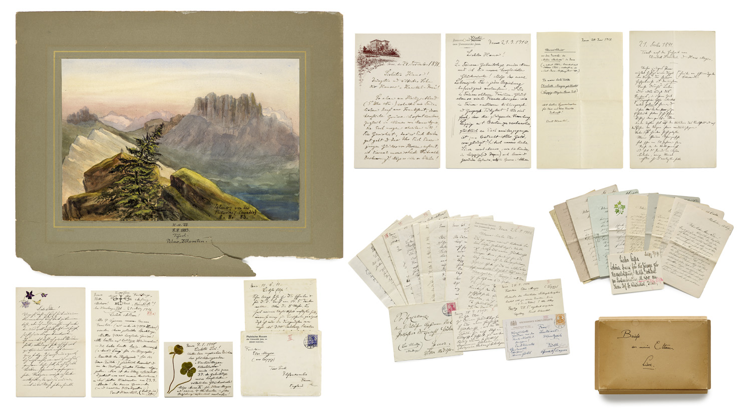 Autographen – Einzigartige Sammlung von Autographen und Aquarellen des bedeutenden deutschen Zoologen, Philosophen, Zeichners sowie Hochschullehrer in Jena, Ernst Haeckel (1834-1919), sowie Briefe an ihn. - Die Sammlung gibt beredtes Zeugnis über Ernst Haeckels Privatleben, und ermöglicht darüber hinaus einen ergänzenden, der Forschung bislang weitgehend unbekannten Einblick in seine Seele, sein privates, meist selbstbezogenes Denken und Handeln. - Enthält: I. 79 Autographen von Ernst Haeckel. - I.1. 47 Briefe und 3 Billets bzw. Postkarten an Tochter Elisabeth Haeckel (1871-1946) und/oder Schwiegersohn Hans Meyer (1858-1929), wichtiger Afrikaforscher u. Verleger (Bibliographisches Institut). - I.2. 22 Briefe und 4 Billets bzw. Postkarten an Lieblingsenkelin "Actissa", d.i. Else Meyer (1894-1976), mit Liste der auf Wunsch verfügbaren Transkriptionen. - I.3. 3 weitere Autographen: Brief an seine Eltern Carl (1781-1871) und Charlotte (1799-1889) v. 1871, Vermächtnis v. 28.6.1918 und Hochzeitstoast für Elisabeth und Hans v. Sept. 1891. - II. 26 Briefe an Ernst Haeckel. - II.1 25 Briefe von Elisabeth Haeckel und/oder Hans Meyer sowie weiteren an Ernst und/oder an Agnes Haeckel (geb. Huschke, 1842-1915). - II.2 Brief von Agnes Haeckel an Ernst Haeckel. - Einige der Briefe im horizontalen Mittelfalz mit Tesa verstärkt. - III. 3 Aquarelle von Ernst Haeckel. - III.1. Pelmo (Monte Pelmo, Südtirol). 1883. Bleistift, Feder in Tusche und Aquarell auf starkem Papier. 34,7 x 23,7 cm. Vollflächig montiert auf Trägerkarton mit doppelter Goldrahmung, im Druck links bezeichnet "Aquarellskizze" und rechts "Ernst Haeckel, Jena". Mittig auf Trägerkarton und mittig rechts in der Darstellung signiert, bezeichnet und datiert (etw. aufgewellt und mit Knickspuren, der Karton im unteren Rand beschädigt). - III. 2. Lydica. Sardes (Tutücken-Zelte vor Bergkulisse bei Sardes, Anatolien). 1887. Bleistift, Feder in Tusche und Aquarell auf starkem Papier. 34,4 x 23,3 cm. Punktuell montiert auf dünnem Trägerkarton. Links unen signiert, bezeichnet und datiert (punktuell gering braunfleckig). - III.3. Lobdeburg bei Jena. 1868. Aquarelle auf starkem Papier. 48,5 x 32 cm. (Ehemals) punktuell montiert auf dickem Trägerkarton. Mittig links mit Tinte signiert, bezeichnet und datiert (punktuell minimal brauchfleckig, Trägerkarton liegt bei).