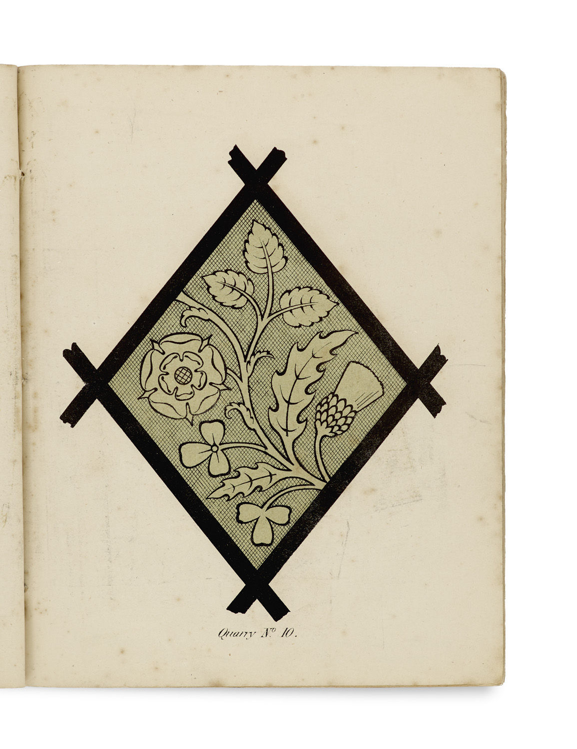 (Chance Brothers & Co). Patterns of Quarries and borders. Musterkatalog mit 27 nn. chromolithogr. illustr. Blätter. o.O. (Birmingham) u. Dr., 1853. Gr.-8°. Marmor. HLwd. mit mont. Deckeltitel (etw. berieben u. bestoßen, Lwd. gering fleckig).
