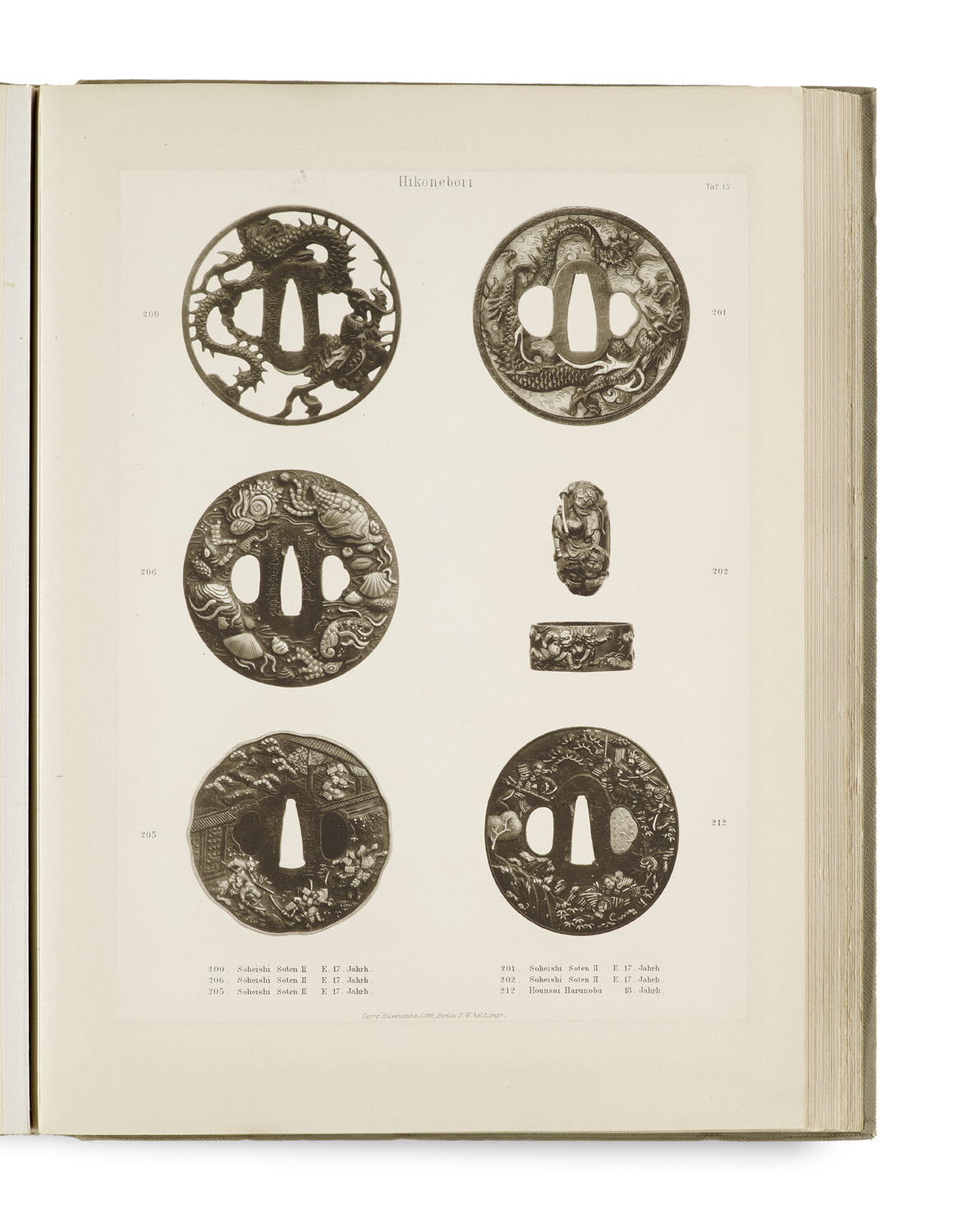 Japanische Schwertzieraten. Beschreibung einer Kunstgeschichtliche geordneten Sammlung, mit Charakteristiken der Künstler und Schulen. Text- und Tafelband. Mit 37 Tafeln mit Heliogravüre. Leipzig, Karl W. Hiersemann, 1904. 4 Bll., 139 S. 8° u. Folio. Lwd. mit schwarzgepr. Titel (leicht berieben und fleckig, Rücken sonnengebleicht).