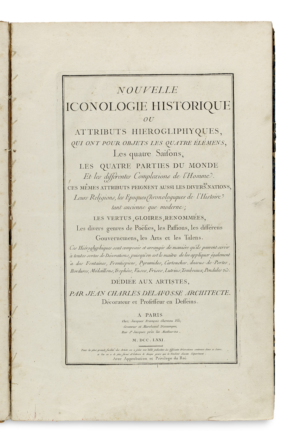 Nouvelle iconologie historique ou Attributs hiéroglyphiques, qui ont pour objets les quatre Élémens, les quatre Saisons, les quare Parties du Monde et les différentes Complexions de l'Homme ... Bände I und II. Mit insgesamt 270 gestochenen Blättern, wovon 249 Bildtafeln (darunter 20 mit je 2 Stichen und vielen mit mehreren Figuren), 2 mit illustrativen Kartuschen versehenen Inhaltsverzeichnissen, kalligraphischem Titelblatt, sowie 18 weiteren, zweiseitig gestochenen Textblättern, alle nach Zeichnungen bzw. Kalligraphie d. Verf. Paris, Jacques Francois Chereau Fils, 1771. Bd. I: 2 Bll. (Tit., Inhaltsverz. 1), Texts. 1-6, Taf. 1-12, Texts. 1-6, Taf. 13-26 (inkl. 15B), Texts. 1-3 (1), Taf. 27-37, Texts. 1-4, Taf. 38-48, Texts. 1-5 (1), Taf. 49-61, Texts. 1-4, Taf. 62-69, Texts. 1-3 (1), Taf. 70-79, Texts. 1-4, Taf. 80-91 (inkl. 90B), Texts. 1-2, Taf. 92-100, Texts. 1-2, Taf. 101-108. Bd. II: 1 Bl. (Inhaltsverz. 2), 161 Stiche auf 141 Tafeln. Gr.-Folio. HLdr. d. Zt. mit goldgepr. RTit. auf mont. Ldr.-Schildern, die Decken mit geädertem blauem Kleisterpapier bezogen, dazu umseitiger gesprenkelter Rotschnitt (Bd. 1 später neu vernähnt, Bindung gelockert, Rücken mit Fehlstellen und teils angebrochenen Gelenken, beschabt und berieben, Ecken bestoßen, teils schmutzfleckig).