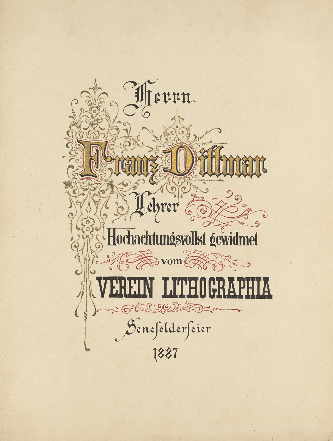 Herrn Franz Dittmar Lehrer hochachtungsvoll gewidmet vom Verein Lithographia Senefelderfeier 1887. Mit kalligraphischem Titelblatt und 63 vorwiegend montierten Chromolithographien. Titelblatt, 22 Bll. Folio. Lwd. Flügelmappe mit Schließe und schwarzgepr. Bordüre, goldgepr. Aufschrift und mont. Innnenkanten Verzierung.(Bestoßen und berieben. Leicht befleckt. Papier Bezug der Lwd.-Innengelenk rissig.)