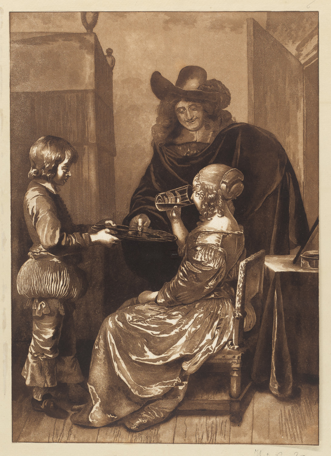 Science of Art – Album with all 46 so-called 'hoofdprenten'. 46 prints after paintings and drawings by Dutch and Flemish artists. Various techniques, aquatint, mezzotint, roulette a.o., some combined. Each spot-mounted to firm D&C BLAUW laid paper album pages (with watermark). Half calf circa 1850, with marbled covers and gilt title label on spine (somewhat scuffed, rubbed and bumped). - The album contains all prints, including the title, which were printed by Ploos himself or under his supervision by his assistants Bernard Schreuder, Cornelis Brouwer and Johannes Körnlein. - These each with the artist's mark on the verso lower left (the coat of arms of Ploos van Amstel) (Lugt, L.2725). - With an additional print which is not part of this series, 'Dame bij kaarslicht', published by Josi in 1821. Ploos (1726-1798) began his second career in the early 1760s with the publication of facsimiles of drawings in a technique he developed himself. The term prenttekening (print drawing) is used in the contract concluded with his first assistant in 1765 and remained in use until late in his career, although Ploos himself called it actypa (impression) on his dedication print for the series. - The album pages with handwritten inscriptions in pencil, some spotting. Overall in very well preserved condition. The prints throughout splendid and differentiated in impression, impressively illustrating the graphic values. -- All the prints included, including print states, are available on request.
