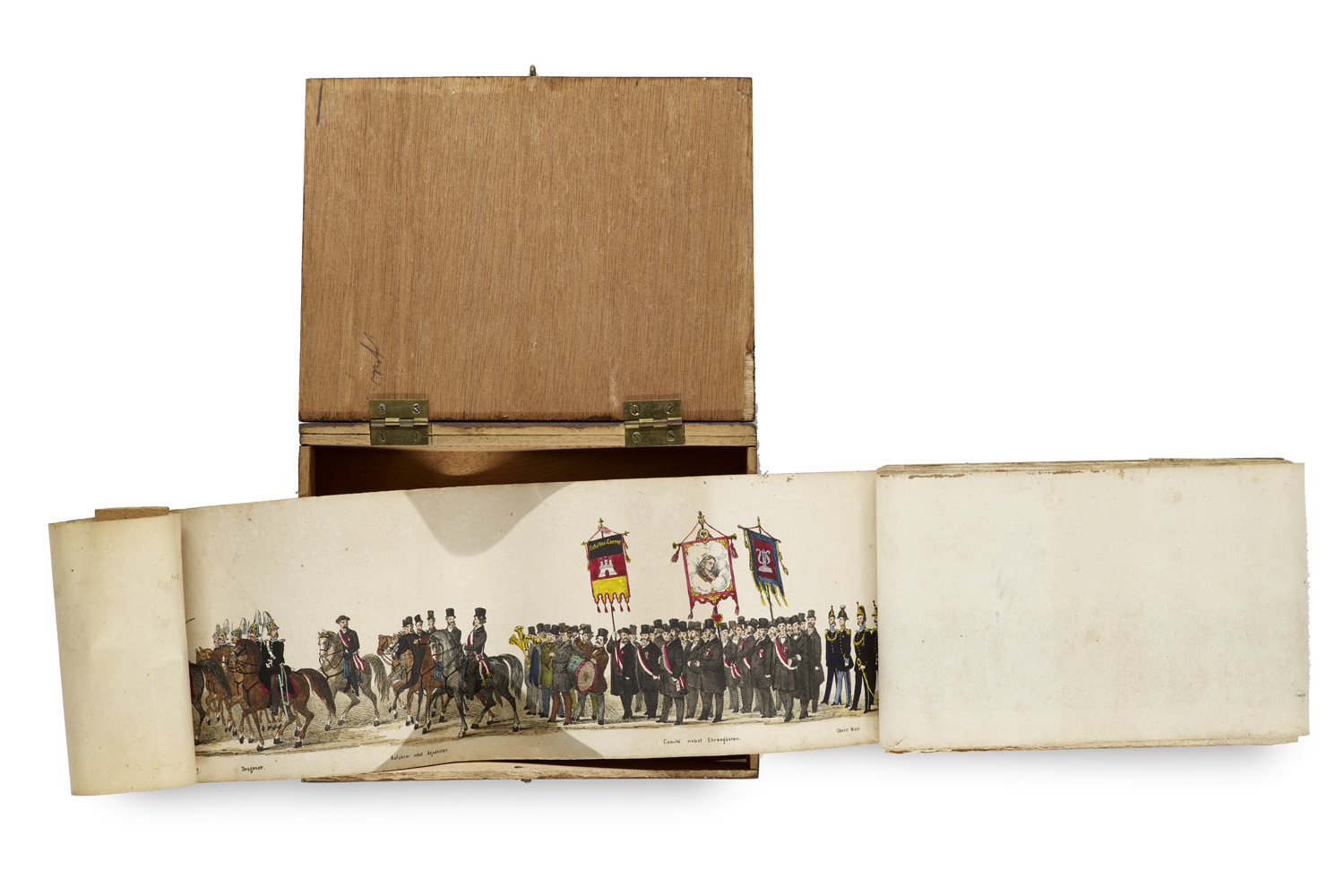 Science of Art – Hamburg procession commemorating Friedrich Schiller on November 13, 1859. Hand-coloured lithograph by C. Adler. In 32 sheets arranged side by side (approx. 12.3 x 1200 cm). Mounted on wooden strips at the outer margins and wrapped around wooden board. In contemp. wooden box with a clasp. - The wooden box lid bears a handwritten copy of a quotation by Bernhard Endrulat from "Der Schillerfestzug in Hamburg ...", p. 227. Inside a sheet of paper with handwritten notes confirming the completeness of the procession and listing the groups of people not included by the publisher, C. Adler. - Browned due to paper, some brownspots, overall well preserved and beautifully coloured.