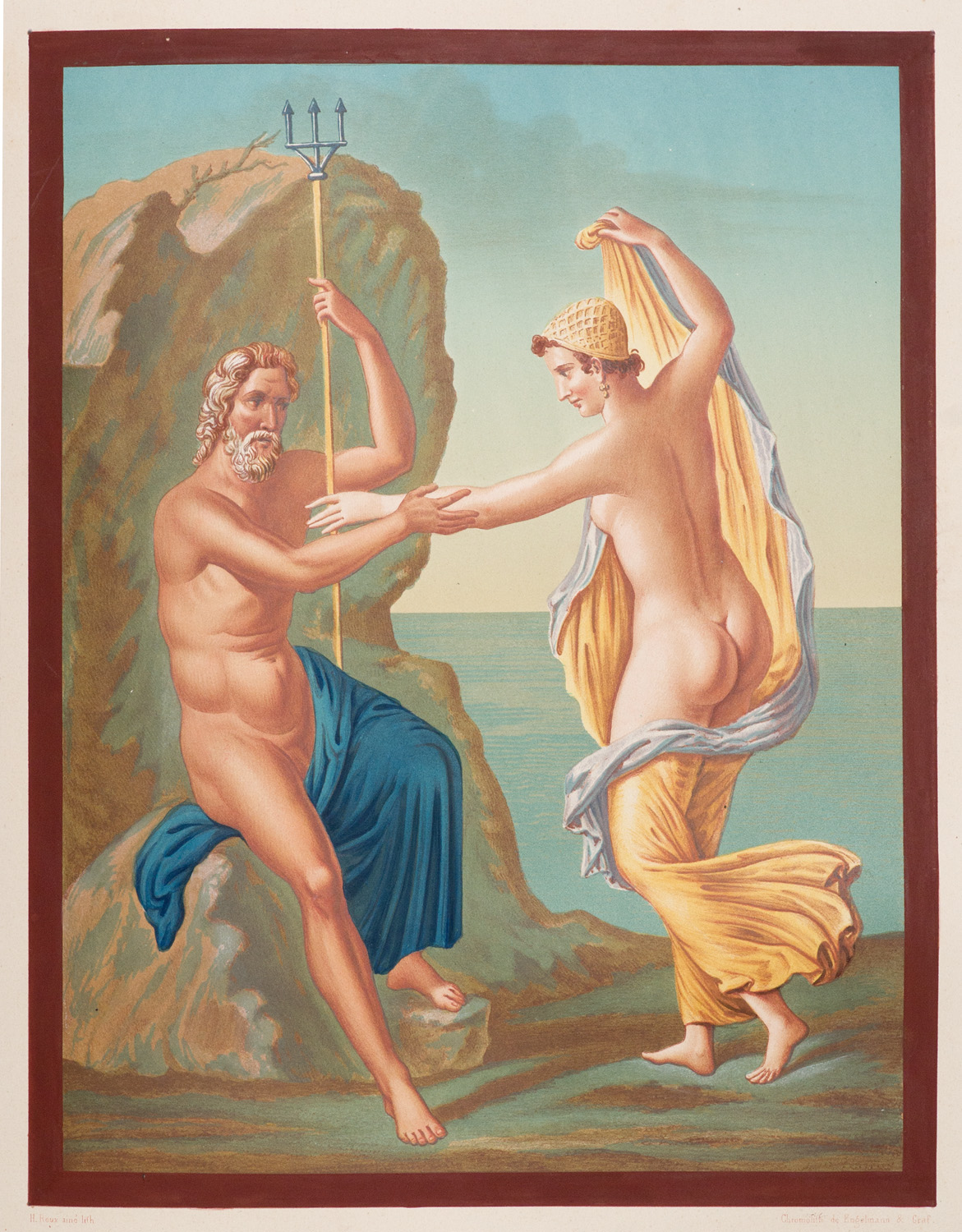 Architecture – With 28 chromolithographic plates. At present no complete copy of the complete edition can be proven for us in international trade. Posthumous edition with the editing of the last issue of Ernest Vinet of the work published in deliveries from 1844-1853. - Red half shagreen leather binding with gilt-stamped title and gilt edges (rubbed and chafed, scratches, leather stained). - Raoul Rochette (1789-1854) was a French classical archaeologist. As an archaeologist and specialist in ceramics, epigraphy and numismatics, he was the leading antiquity scholar in France of his era. From 1818 to 1848 he was curator at the Bibliothèque royale in Paris and pioneer of comparative archaeology and art history. The magnificent panels show: The magnificent panels show wall paintings and interior views from Pompeii: 1. Jupiter and Juno on Mount Ida 2. Neptune and Amymone 3. Bacchus and Ariadne on Naxos 4. wall in the temple of Augustus 5. Apollo and Daphne 6. Bacchus and Ariadne 7. Hercules and Iole 8. wall in the temple of Venus 9. Adonis dies in the arms of Venus 10. Hermaphrodite 11. Paris 12. wall in the Casa della Caccia antica 13. Daedalus and Parsiphae 14. Danae on the island of Serifos 15. Hylas with the nymphs 16. wall in the Casa della Caccia antica 17. Io in Egypt 18. Mars and Venus 19. Hercules in the omphale 20. Achilles on Skyros (1) 21. Achilles on Skyros (2) 22. Medea with the children 23. direction 24. house of Saturninus/ The black wall in Pompeii 25. Cassandra and Priamus 26. Perseus and Andromeda 27. Theseus and Ariadne 28. personifications of Europe, Asia and Africa. - Protective sheets and pages in the broad white margin mostly foxed, a few plates slightly browned due to paper, plates predominantly clean and in a splendid and bright colouring.