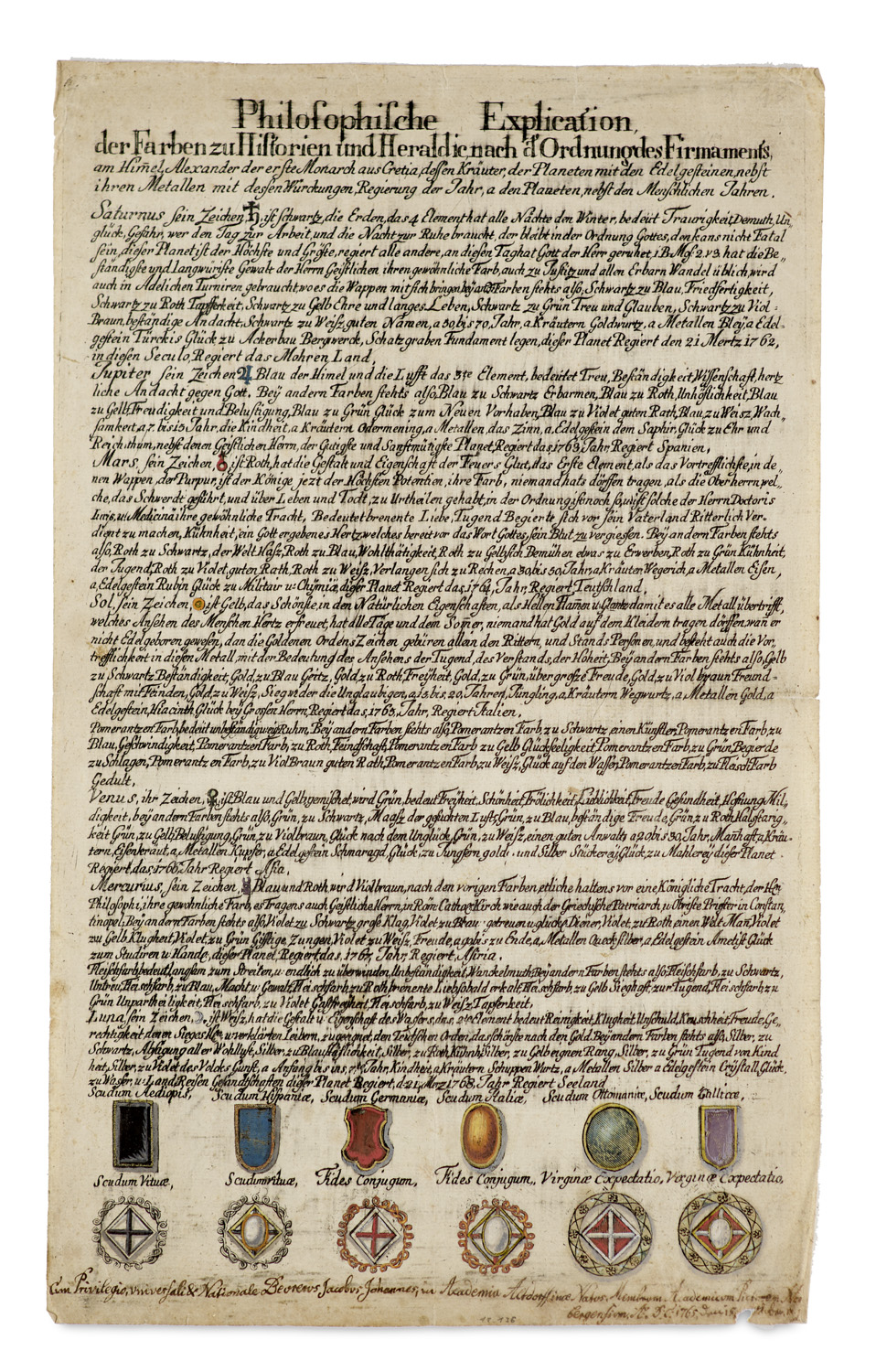 Philosophische Explication der Farben zu Historien und Heraldic nach d(er) Ordnung des Firmaments, am Himmel, Alexander der erste Monarch aus Gretia, dessen Kräuter, ... den Planeten mit den Edelsteinen, nebst ihren Metallen mit dessen Würckungen, Regierung der Jahr, den Planeten, nebst den Menschlichen Jahren. Kupferstich mit 12 kolorierten Wappenschildern und heraldischen Symbolen. o.O., o.Dr. u. J. (1765). Einblattdruck. Format ca. 40,5 x 24,7 cm.