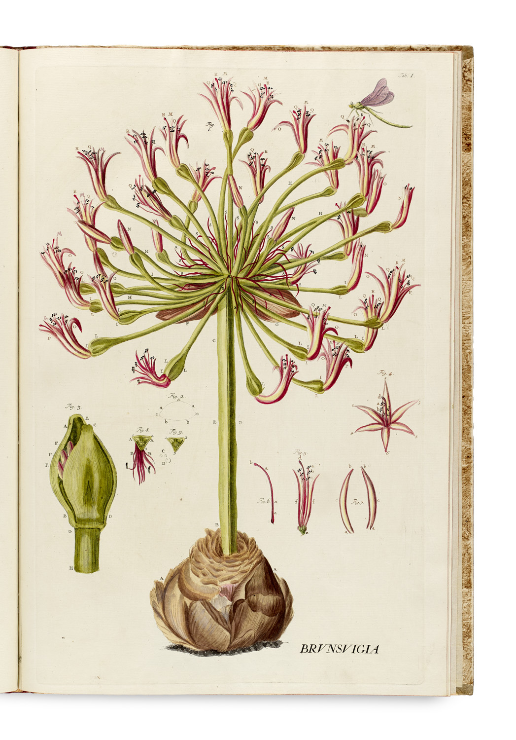 Naturwissenschaften – Nissen BBI 842. - Pritzel 3922. - Stafleu II, 2592. - nicht bei Hunt Library Cat. - Kein Exemplar im internationalen Handel für uns derzeit nachweisbar, nur 1 Exemplar auf Auktionen der letzten 35 Jahre. Prachtvolle lateinische Monographie, in der ein neues, außerordentlich seltenes und besonders prächtiges afrikanisches Zwiebelgewächs vorgestellt wird. Dem Herzog von Braunschweig-Lüneburg wird zu Ehren das neue Pflanzengeschlecht benannt, woraus die später gebräuchliche Gattungsbezeichnung Brunsvigia hervorgeht. In stiltypisch gelehrtem Latein erläutert Heister die Merkmale dieser Pflanze, beschreibt Aufbau, Wuchsform, Blätter, Blütenstand, Blütenstruktur, Zwiebel und Frucht, und grenzt sie sorgfältig von anderen bekannten Gattungen und Arten ab, wobei er ausdrücklich auf Irrtümer ("hallucinationes") früherer Autoren hinweist und eigene Korrekturen anbietet. Die Familie umfasst etwa 20 Arten, die im südöstlichen und südlichen Afrika von Tansania bis zu den Kapprovinzen Südafrikas heimisch sind. Zwei Jahre später beschrieb Lorenz Heister eine Pflanze aus der Familie der Amaryllisgewächse, Aztekenlilien oder Jakobs-Lilien, die nach Johann Heinrich von Spreckelsen (1691-1764) benannt wurde, der Heister die Pflanzen geliefert hatte. Spreckelsen könnte auch an der Verbreitung der Brunsvigia beteiligt gewesen sein. Der deutsche Jurist und Hamburger Ratssekretär von Spreckelsen ließ in Hamburg den ersten privaten botanischen Garten anlegen, den der Naturforscher Carl von Linné bereits 1735 besucht hatte. Spreckelsen hatte dem Botaniker Lorenz Heister die ersten Exemplare von Lauchgewächsen aus seinem Garten zugesandt, woraufhin sie 1755 zu seinen Ehren den Gattungsnamen Sprekelia erhielten. Der Text ist vergleichsweise kompakt, dafür aber sehr konzentriert auf die botanische Charakterisierung und die systematische Einordnung der Pflanze, wie sie im 18. Jahrhundert üblich war. Ergänzt wird diese Beschreibung durch aufwendig gestaltete, großformatige Kupfertafeln, die das "rarissima" Gewächs in unterschiedlichen Ansichten zeigen. Die Tafeln sind prachtvoll koloriert und dienen nicht nur der Zierde, sondern vor allem der wissenschaftlichen Demonstration: Sie geben die Pflanze einmal in ihrer Gesamterscheinung mit Blütenstand und Blättern wieder, dazu im Detail die Struktur der einzelnen Blüte - etwa Kronblätter, Staubgefäße und Griffel - sowie die Zwiebel mit ihren Schuppen und die Frucht- bzw. Samenkapseln. Durch diese Kombination aus Gesamtansicht und detailreichen Einzelstudien ermöglichen die Abbildungen dem zeitgenössischen Leser, die in Worten beschriebene Morphologie visuell nachzuvollziehen, was besonders wichtig war, da es sich um eine in Europa kaum zu sehende, aus Afrika stammende Pflanze handelte. - Wohlerhalten.