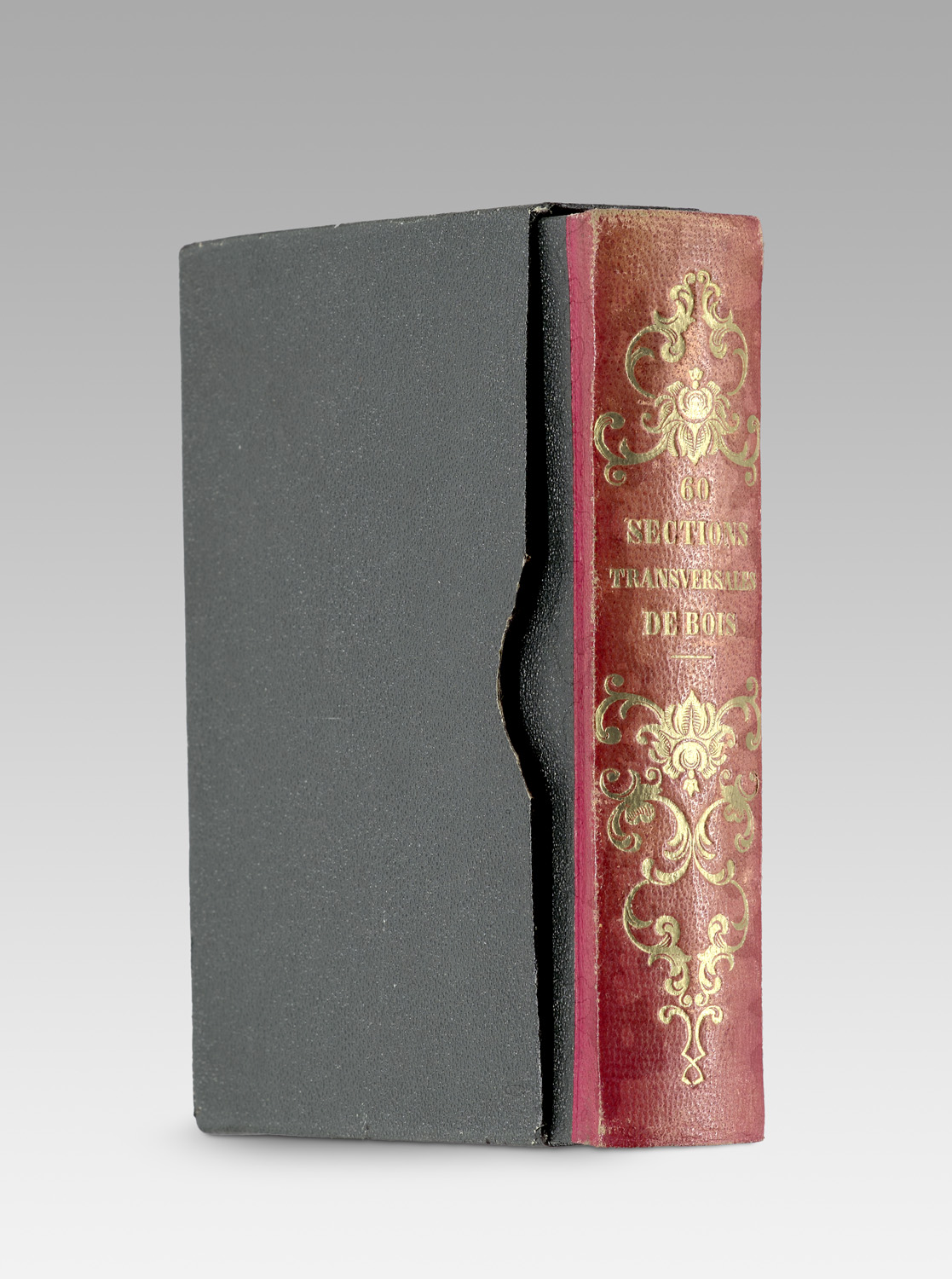 Collection de 60 sections transversales de bois des essences forestières les plus importantes à l'usage des élèves de l'Ecole Forestière de Nancy. Mit 60 originalen Holzmustern. Nancy, Grosjean, o. J. (nicht nach 1851). 2 Bogen mit 8 bedr. S. (Tit., Vorw., Zwischentit., Tafelverz.), 60 montierte Muster in Duodez-Bogen mit diese je auf Vorderseite aufgeklebten, gedr. Namensetiketten. Ca. 15 x 12 cm. Lose in OHLdr.-Kassette mit goldgepr. ornament. RTit., die Außenwände bezogen mit gekämmten Marmorpapier, innen mit einfach gestrichenem Papier, die Deckel mit blindgepr. Papier als Lederimitat. Im OPp.-Schuber mit mit blindgepr. Papier als Lederimitat.