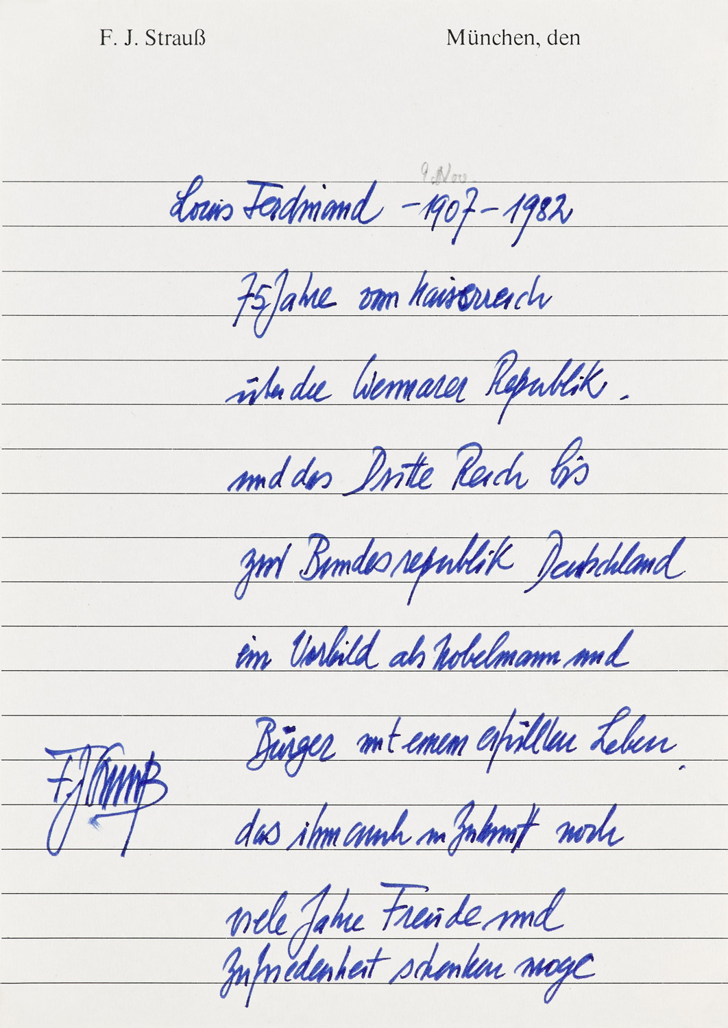 Autographen – Enthält: Herbert Wehner (1906-1990). 2 masch. Briefe mit eh. U. an RA Erwin Cuntz / Herrn Hohmann. Bonn, 15. Nov. 1951. Je 1 S. auf 1 Bl. Schreibpapier des Dt. Bundestags. - Erich Ollenhauer (1901-1963). Masch. Brief mit eh. U. an Genosse Hirsch-Weber. Ebd. 19. Jan. 1953. 1 S. auf 1 Bl. Schreibpapier der SPD. - Dieter Müller (1894-1957). Masch. Brief mit eh. U. des regierenden Bürgermeisters auf dessen Briefpapier an Herrn Müller mit Bezug zur Pferdezucht. Berlin, 28. Feb. 1955. 1 S. auf 1 Bl. - Ernst Lemmer (1898-1970). Masch. Brief als Bundesminister für gesamtdt. Fragen mit eh. U. an Herrn Müller. Ebd., 22. Juli 1960. 1 S. auf 1 Bl. persönl. Briefpapier. - Zur Teilung Deutschlands und dem Verhalten der Westalliierten. - Willi Weyer (1917-1987). Masch. Brief mit eh. U. als 1. Vors. des Landesverbandes Nordrhein-Westfalern der FDP auf dessen Briefpapier an Herrn Hohmann. Düsseldorf, 26. Aug. 1966. 1 S. auf 1 Bl. - Wolfgang Mischnik (1921-2002). Masch. Brief mit eh. U. als Vorsotzender der FDP-Fraktion auf dessen Schreibpapier an Herrn Hohmann. Bonn, 9. Sep. 1976. 1 S. auf 1 Bl. - Bestätigt das Interesse an einem Skatturnier mit dem "Kommunalpilitischen Skatclub". - Franz Josef Strauß (1915-1988). Eh. Aufzeichnungen wohl anlässlich einer Rede zum 75. Geburtstag von Louis Ferdinand, Prinz von Preußen, am 9. Nov. 1982. - Dabei: Werner Hinz (1903-1985). Eh. Brief mit U. des Schauspielers an Dr. von Wintzingerode wegen einer Einladung zu einer Lesung in Wolfsburg. Wien, 28. April 1976. 1 S. auf 1 Bl. - Mit einer Autogrammkarte u. 2 gelaufenen, an Dr. von Wintzingerode adress. Umschlägen (gelocht). - Tls. Faltspuren, insg. wohlerhalten.