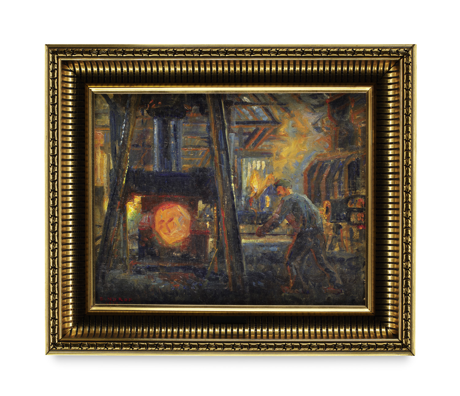 Natural Sciences – Geology - Mining and Metallurgy. - Oil on canvas, fully mounted on wooden panel. Signed and dated. Framed in a gold-colored frame. - Danish painter Børge Christoffer Nyrop was particularly known for his nuanced use of light, influenced by Impressionism. He also depicts the smiths workshop with great painterly sensitivity, creating an appealing contrast between the simple, craft-oriented subject and the atmospheric elaboration. - With minimal surface dust, overall very good. Impressionistic scene illuminated with bold, partly impasto application of paint. The colors vibrant.