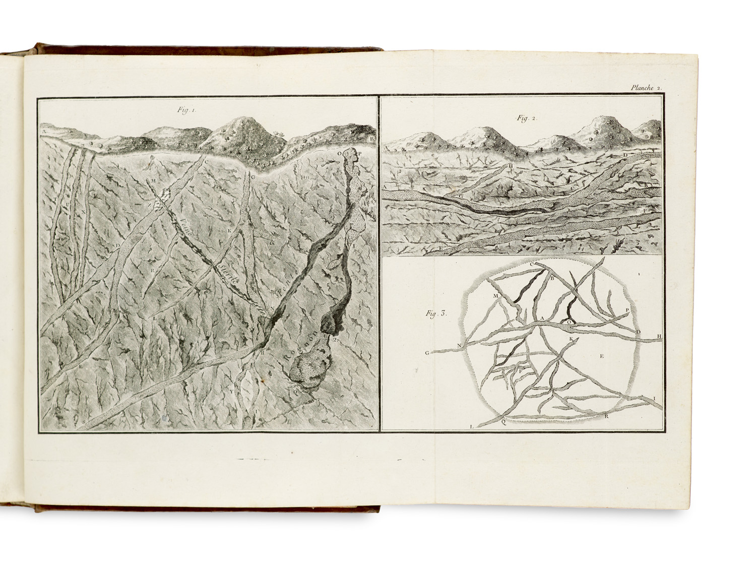 Natural Sciences – Geology. - Mineralogy. - With 14 folded engraved plates and 1 folded chart. First and only edition. Only the first volume was published. Jean-Pierre-François Guillot-Duhamel (1730-1816) was a French engineer. He was among the first students at the newly established mining school, which he attended beginning in 1752. The graduates of this school were the first specifically trained mining engineers and all were excellent metallurgists, of whom Guillot-Duhamel was the best. Together with his mentor, Gabriel Jars, he undertook an extensive journey through Europe to gain practical knowledge. Later, he taught in Paris, became a member of the Académie des Sciences, and received numerous honors. A handbook of mining and surveying from the late 18th century. In it, the author-Royal General Inspector of Mines and professor at the École des Mines-systematizes the geometric and practical methods used to survey underground deposits, draw mine plans, and design tunnel and shaft systems. The focus is on the description of the "filons ou veines minérales"-that is, ore and mineral veins-their orientation within the "earth's interior," their dip, thickness, and mutual intersections, as well as the technical implications for support, mining safety, ventilation, and dewatering. - Manuscript from the Ex Libris Library of Rambourg, Château de Mantassiege, (Nicolas Rambourg (1751-1828) - Louis A. Laville. - Very fine copy.