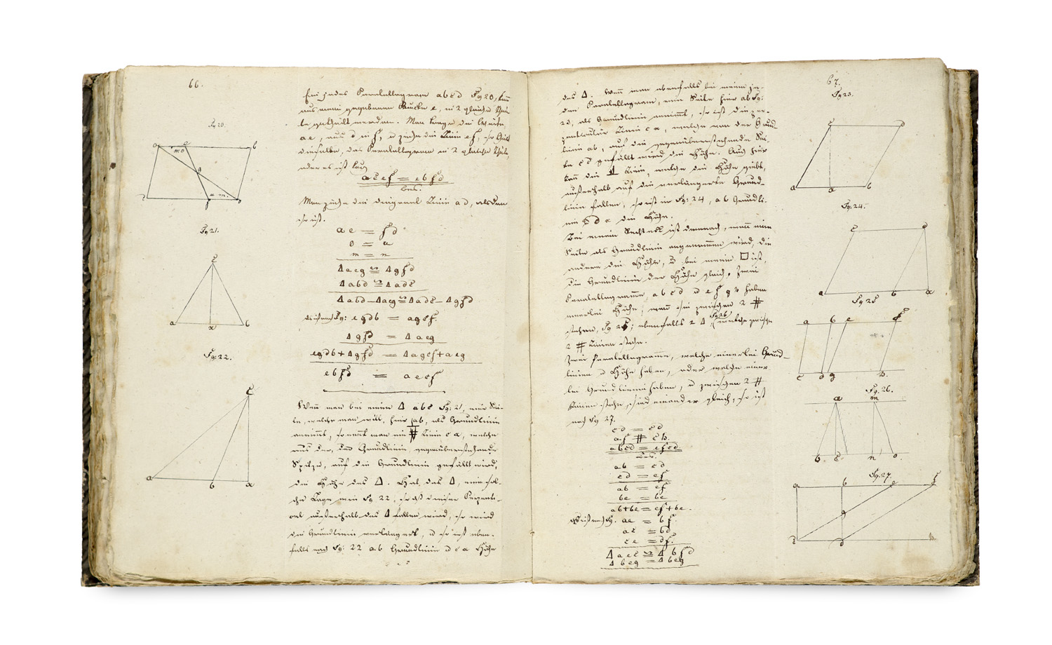 Naturwissenschaften – Wohl Vorlesungsmitschrift mit u.a. folgenden Kapiteln: Von den Dreiecken. - Abhandlung allgemeiner Inf. von Linien und Winkeln. - Von Linien und Winkeln außerhalb eines Kreises. - Erklärung und Eigenschaften der Vierecke. - Vom Flächeninhalt. - Von den Polygonen. - 1 S. Register. - Beiliegend: 1 gefalt. Tabelle zu Triangellinien u. 1 gefalt. geometr. Zeichnung. - unbeschnitten, durchgängig etw. stockfleckig, sonst insg. gut erhalten.