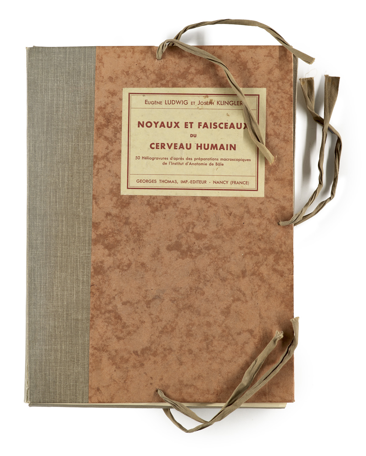 Kerne und Faserbahnen des menschlichen Gehirns. Mit 50 Heliogravüren makroskopischer Präparate aus dem Anatomischen Institut Basel. Nancy, Thomas, o. J. (1938). 4 gefaltete lose Viertelbogen (Vortit., Tit. u. Vorw. in Französisch, Englisch, Deutsch und Italienisch), 50 num. Tafeln (je 235 x 152 mm), montiert unter mit Umrissen in rot bedruckten Pergaminfolien in gefalteten losen Viertelbogen mit viersprachigem Text (Tit., Legenden). Quer-2°. Mit marmor. OHLn.-Mappe mit Titelschild auf Vorderdeckel, Deckenbezug und Wandauskleidung mit Papier im Marmordekor, verschließbar mit 6 Textilbändern (minimal fleckig).