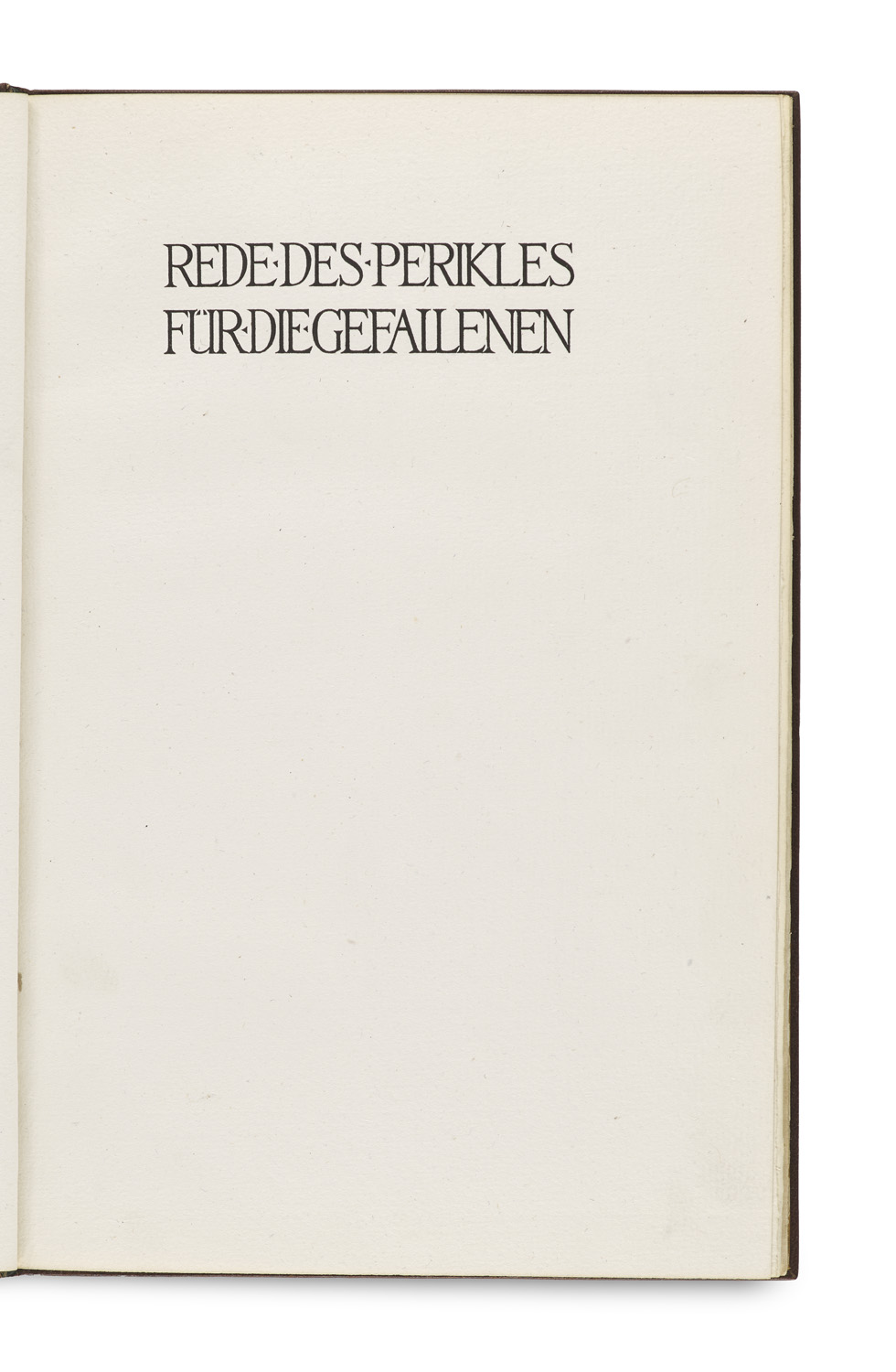 Moderne Literatur und Kunst – Nr. 114 von 225 Exemplaren auf Bütten (GA 250) des Kleukens-Drucks mit der berühmten perikleischen Rede in der Überlieferung von Thykydides. - Rodenberg, S. 104.5. - Fünfter Druck der Kleukens-Presse, der Text mit schlankem Spiegel gesetzt in der für diese Presse modifizierten Kleukens-Antiqua und satt gedruckt auf voluminösem, handgeschöpftem Büttenpapier mit einseitigem Schöpfrand. - Der genauso schlichte wie elegante, im Fußsteg des hinteren Spiegels signierte Handeinband aus der Offizin Werkomer, München. - Vorsätze leimschattig und leicht stockfleckig, sonst wohlerhaltenes Exemplar.