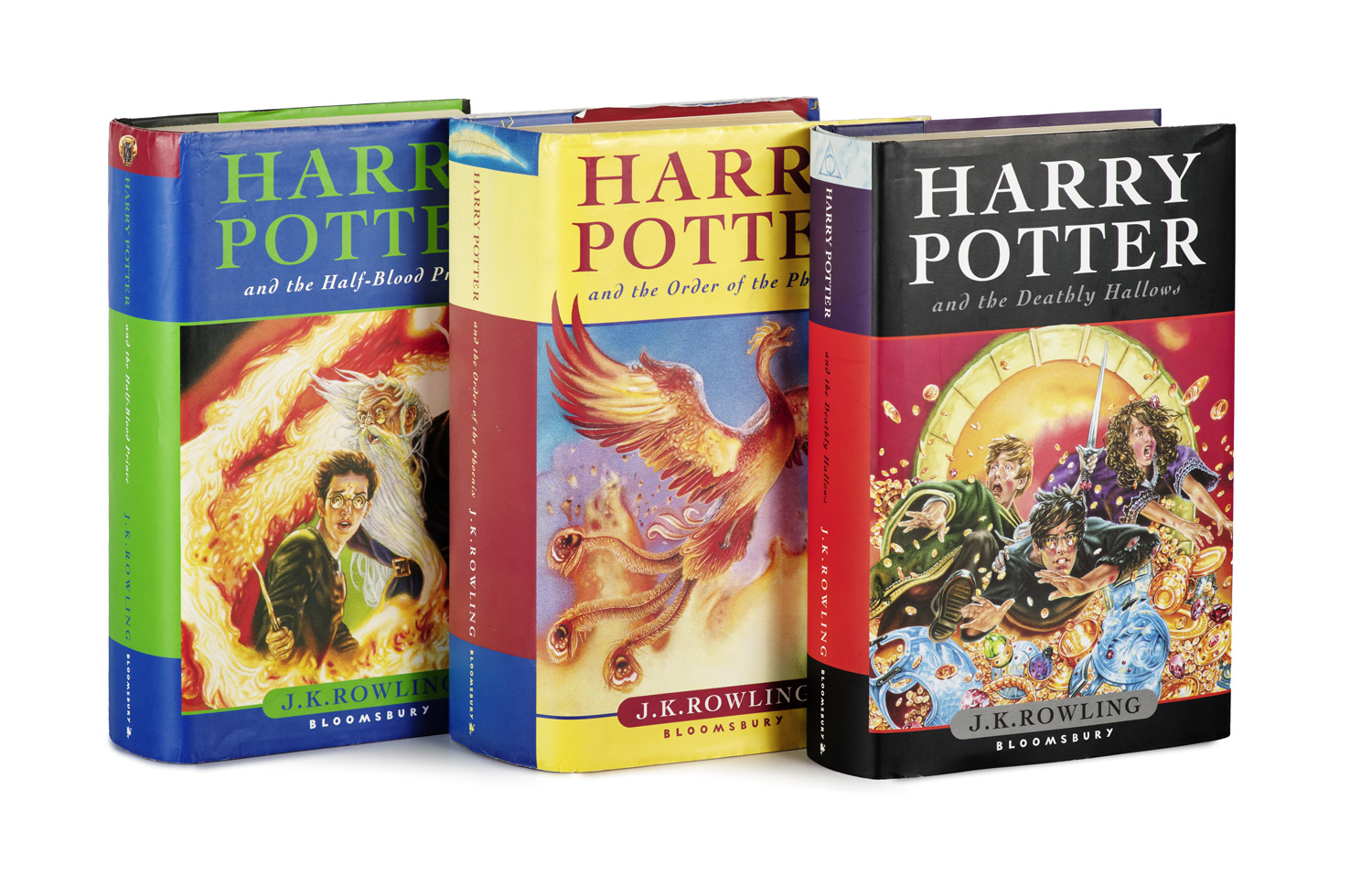 Moderne Literatur und Kunst – I. Harry Potter and the Half-Blood Prince. First Edition. Bloomsbury London, 2005. Mit OSchutzumschlag. - Erste Ausgabe. II. Harry Potter and the Order of the Phoenix, Bloomsbury London, 2003. Mit Original Schutzumschlag. - Druck im Jahr der Erstausgabe. - III. Harry Potter and the Deathly Hallows, London Bloomsbury 2007. - Mit Schutzumschlag. First Edition. IV. Harry Potter and the Goblet of Fire, New York Scholastic Press. 2000. First American Edition. - Druck im Jahr der Erstausgabe.