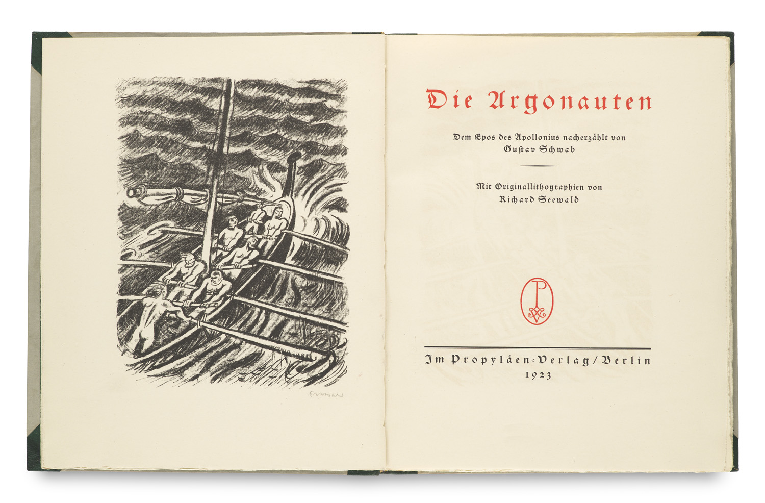Die Argonauten. Dem Epos des Apollonius nacherzählt von Gustav Schwab. Mit 43 Originallithographien von Richard Seewald (11 ganzs., Frontispiz vom Künstler signiert). Berlin, Propyläen Verlag, 1923. 74 S., 3 Bll. 4°. Original-HMaroquin mit DIllustration und goldgepr. RTitel, Kopfgoldschnitt (Kapitale leicht berieben). In OPp.-Umschlag und -Schuber.