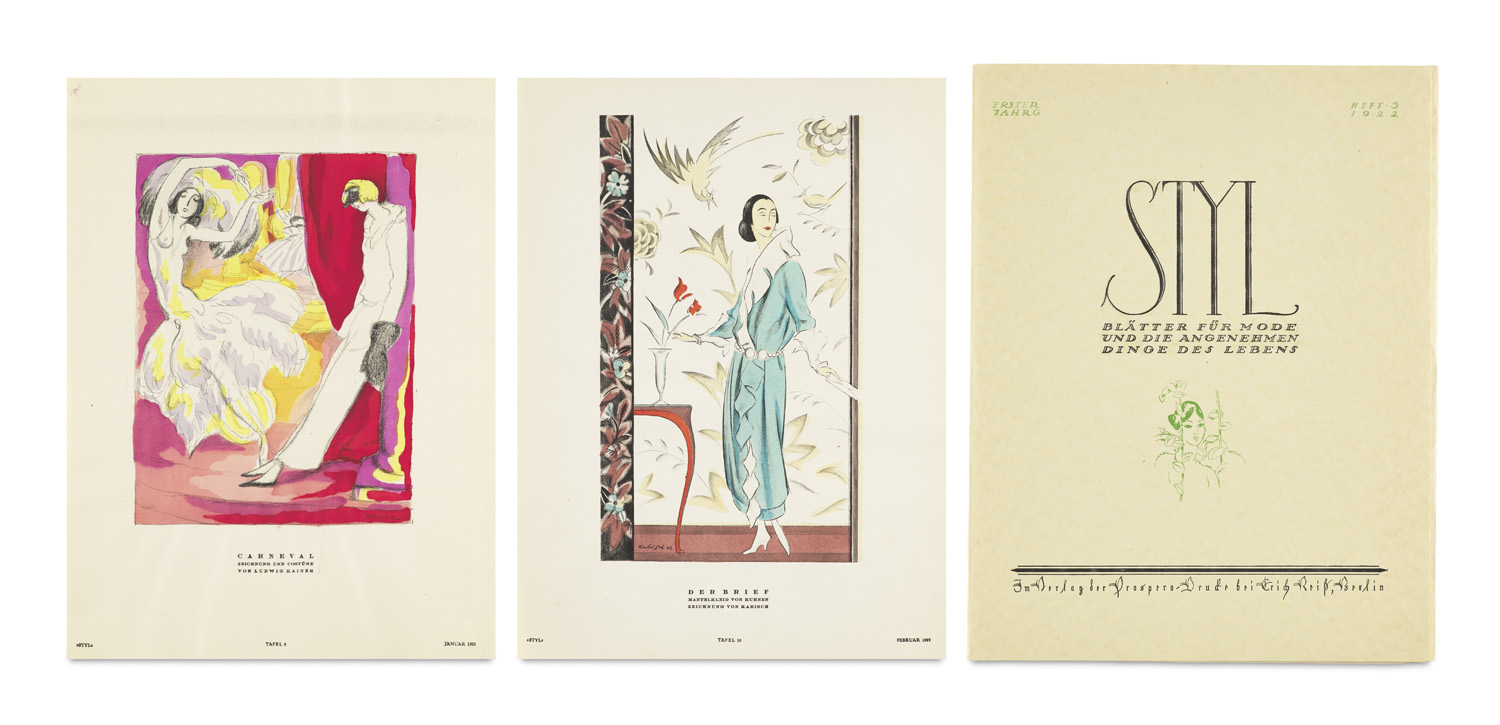 Styl. Blätter für Mode und die angenehmen Dinge des Lebens. Red. von R. L. Leonhard und L. Sternaux. Jg. I-III (alles Erschienene) in 17 Heften. Mit zusammen 206 (nach Tafelverzeichnissen so komplett) meist pochoirkolorierten bzw. handkolorierten Tafeln und zahlreichen teils ebenfalls pochoirkolorierten bzw. handkolorierten Textabbildungen und Beilagen. Berlin, 1922-1924. 4°. Lose Blätter und Bogen in illustrierter OKartonmappe, in Orig.-HLwd.-Kassette (Jg. 1, im Format etwas größer) und Orig.-Papp-Kassette mit Deckelschild (Kassetten teils beschabt und etwas fleckig bzw. lichtrandig).
