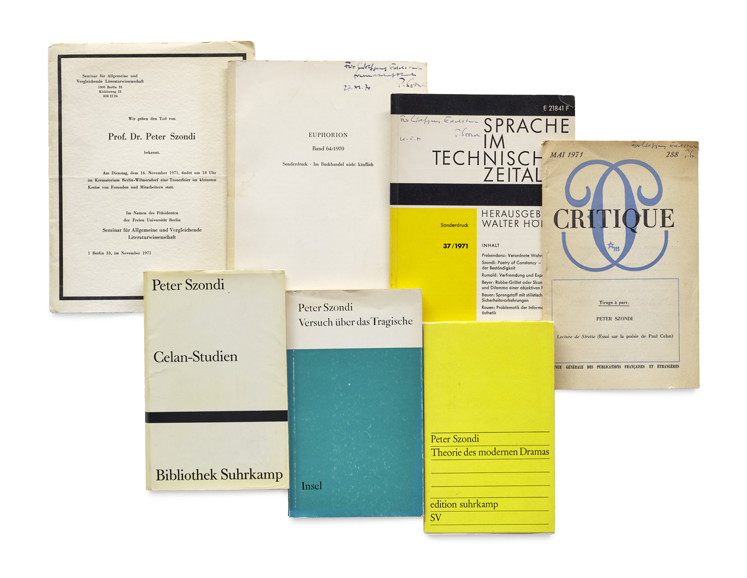 Moderne Literatur und Kunst – Enthält: Versuch über das Tragische. 2.A. Ffm., Insel, 1964. OKart. - Theorie des modernen Dramas. 5.A. Ed. Suhrkamp 27 (1968). OKart. - Fr. Schlegels Theorie der Dichtarten. SDr. (aus Euphorion 64/1970). OKart. - Poetry of Constancy ... SDr. (aus Sprache im techn. Zeitalter 37/1971). OKart. - Lecture de Strette. SDr. (aus Critique 288, Mai 1971). OBr. - Celan-Studien. Bibl. Suhrkamp 330 (Ffm. 1972). OPp. im OU. - Dabei: Todesanzeige von Prof. Dr. Peter Szondi, November 1971. 2 Bll. Gr.-8°.