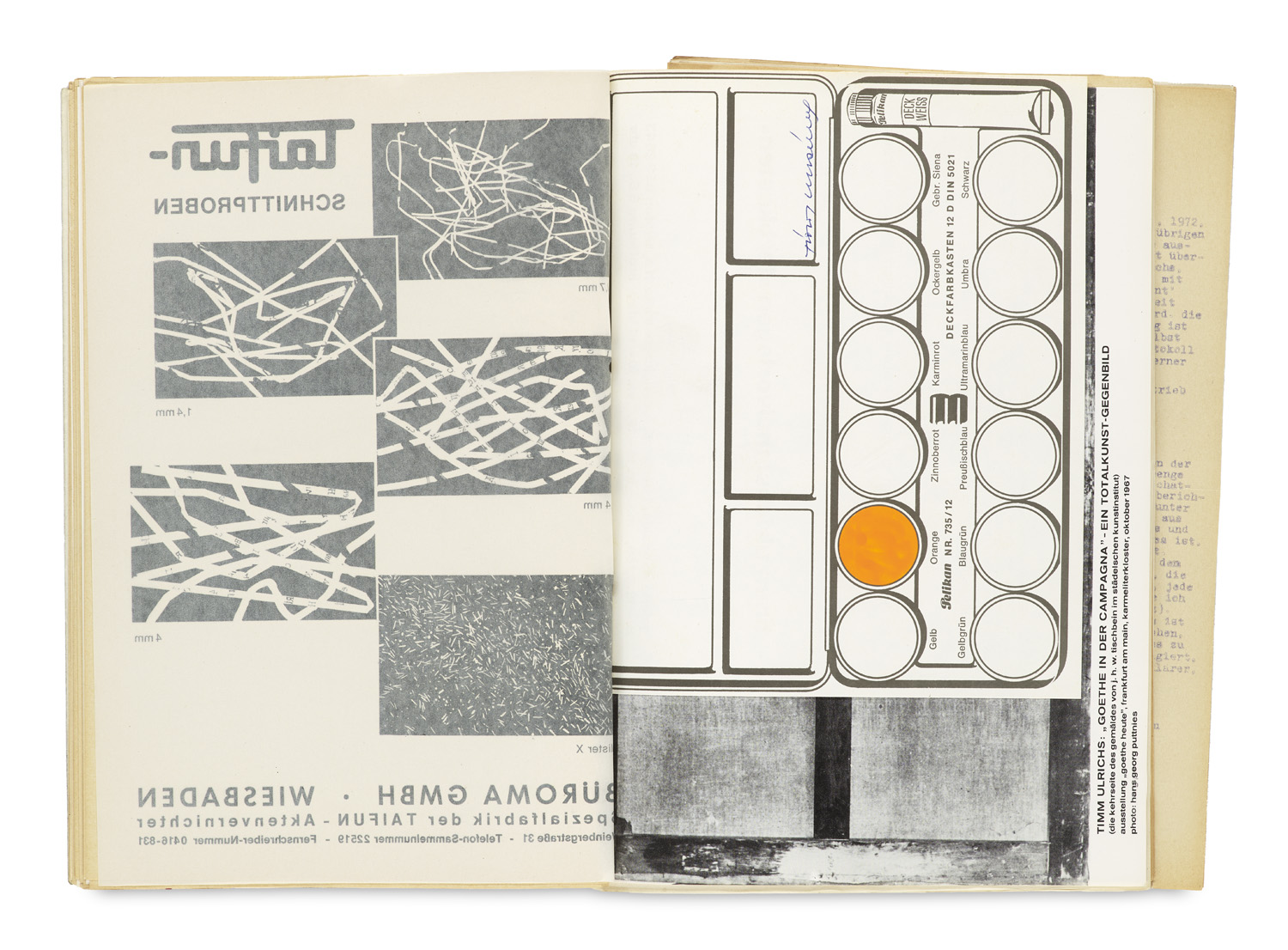 Modern Literature and Art – Includes the Malvorlage Deckfarbenkasten and hand-colored orange. - Catalogue of ideas by the German artist and sculptor Timm Ulrichs. His works can be classified as Neo-Dadaism and Conceptual Art. - Overall, very well preserved. - Includes: as listed above.