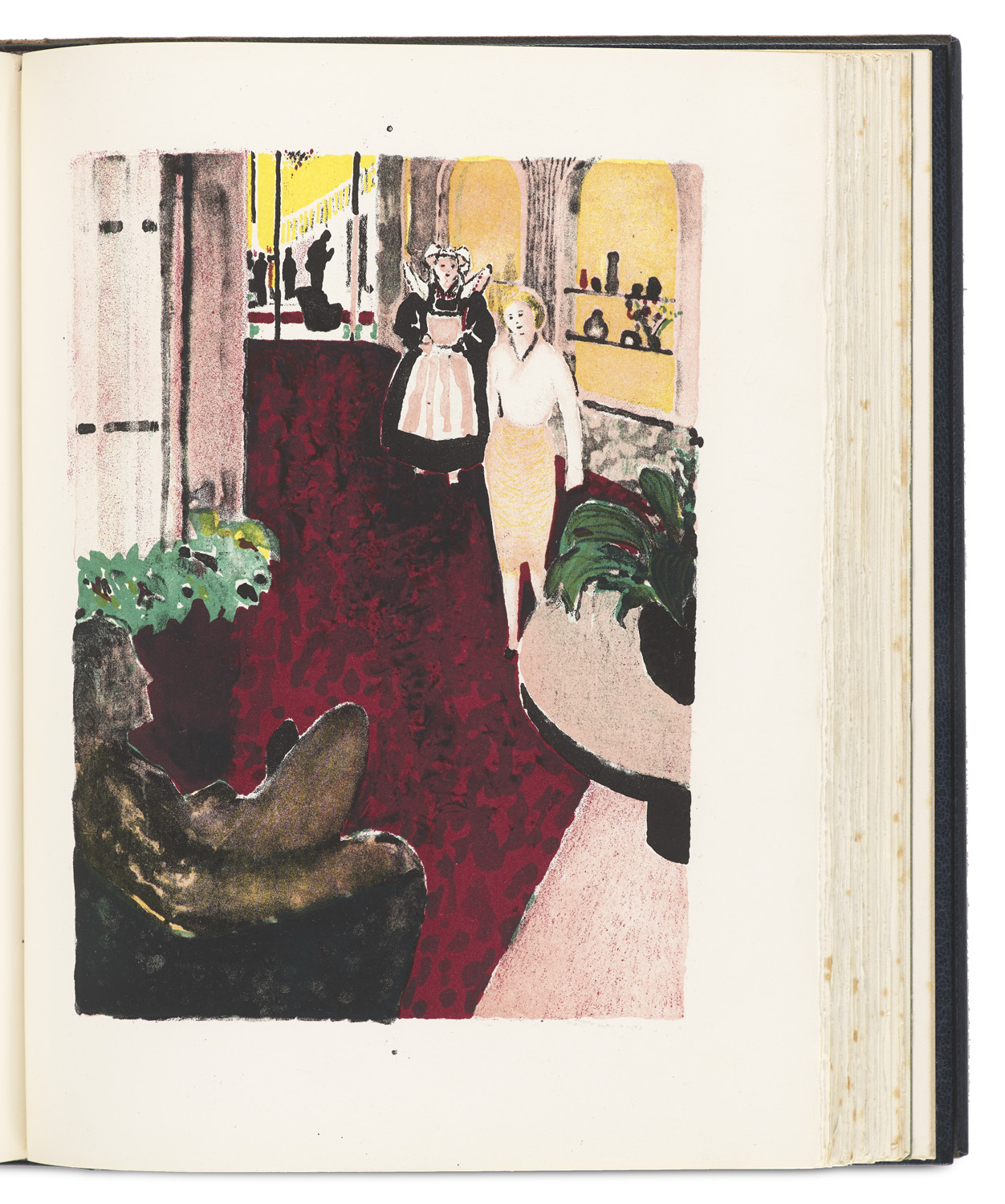 Remorques. Mit 30 meist ganzseitigen Farblithographien. O. O. (Paris), Les Bibliophiles des France, o. J. (1957). 243 S. 2 Bll. 4°. Dunkelblauer Maroquin mit goldgepr. RTitel mit Innenspiegel und Vorsätzen aus Furnier in HLdr. Chemise mit Furniereinlage und weiterem gefüttertem Schuber aus Funier. Mit Büttenrand und goldenem Kopfschnitt. OUmschlag eingebunden. Signiert: Lucie Weill. (Minimal bestoßen).