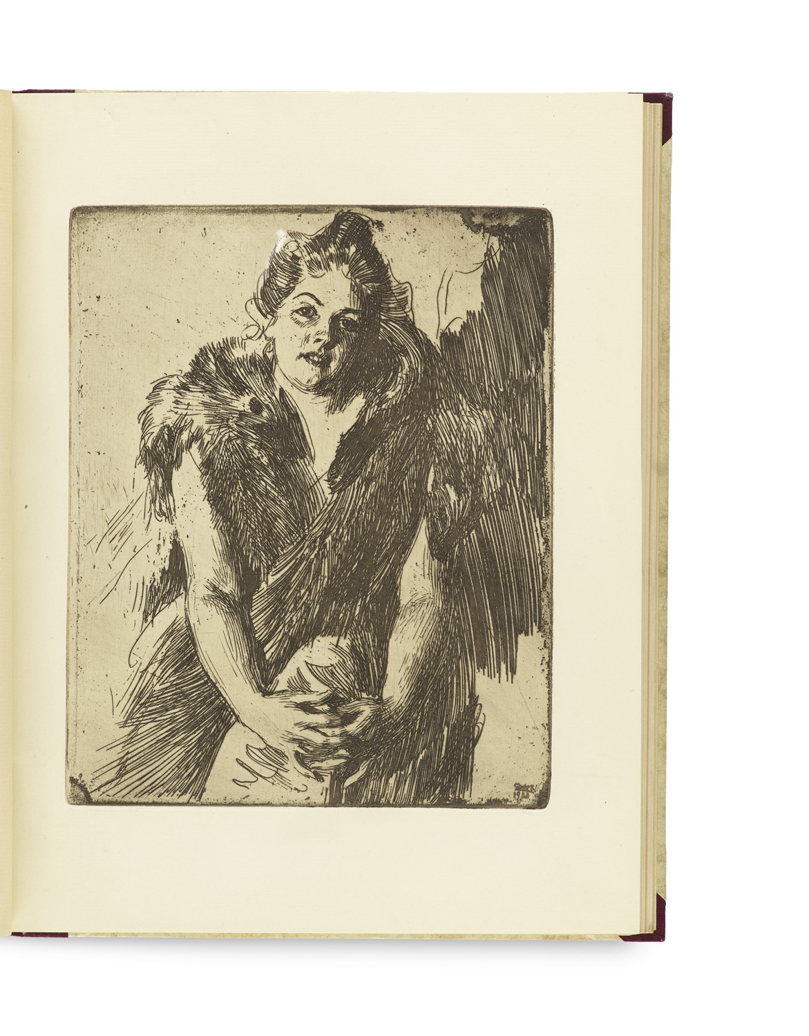 Zorns graverade verk. Andra Delen (Tl. 2 v. 2). Mit 46 ORadierungen u. zahlr. Abb. nach Radierungen (Abb. 122-288). Stockholm, A.-B. H. Bukowskis Konsthandel, 1921. S. 195-452, 6 Bl. (Rättelser och Tillägg, Register, Bl. 44a). 4°. HLwd. d. Zt. (sign. Buchbinderei H. Nickel) mit mont. DSchild (dieses mit Läsuren), OBrosch. mit eingebunden (Deckblatt etw. knitterig, 21 kl. Randeinrisse).