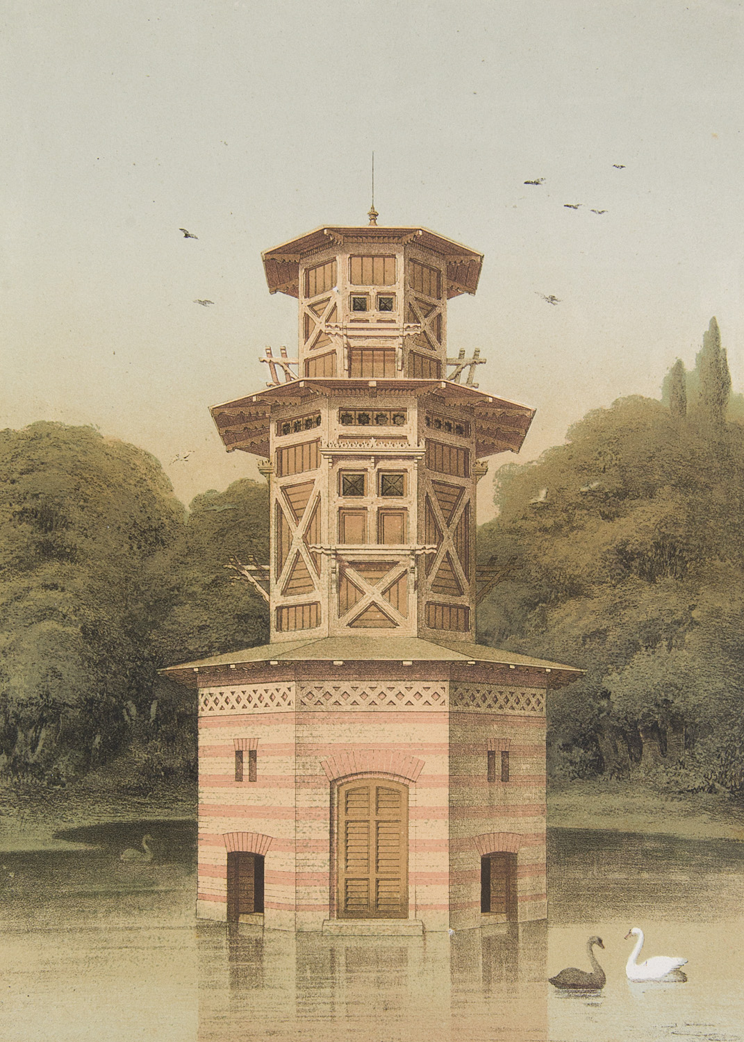 Architecture – 70 booklets (of 201). With approx. 430 (chrome) lithographic and engraved plates. Berlin, Ernst u. Korn, 1863-1875. Fol. Brochure of the time (cover sheets partly loose, (brown) stained and with tears, partly with bookseller's stamp). - Architecture magazine with 5 or 6 fascicles per year, each fascicle containing 6 plates of rural and urban buildings, gardens, architectural elements. With planimetries, sections, views, detailed drawings, etc., mainly from Berlin and Potsdam. - Rare periodical with designs by Friedrich August Stüler, Ludwig Persius, Martin Gropius, Ferdinand von Arnim, Hitzig and many others. - Partially browned and foxed, some leaves with minor marginal defects.