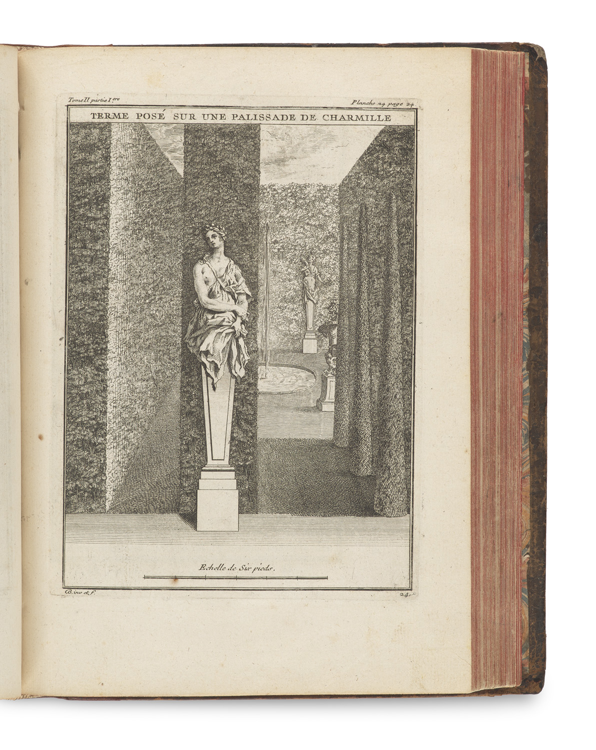 De la Distribution des Maisons de Plaisance et de la Decoration des Edifices en general. Tome Second. Bd. 2 (v. 2). Mit Titel in Rot und Schwarz, gestochener Titelvignette, 111 gestochenen Tafeln sowie einigen gestochenen Vignetten und Initialen. Paris, Jombert, 1738. VII, 180 S. 4°. Ldr. d. Zt. mit RVergoldung und zwei goldgepr. RSchildern, Marmorvorsätzen und Rotschnitt (etwas berieben und bestoßen, Rücken restauriert).