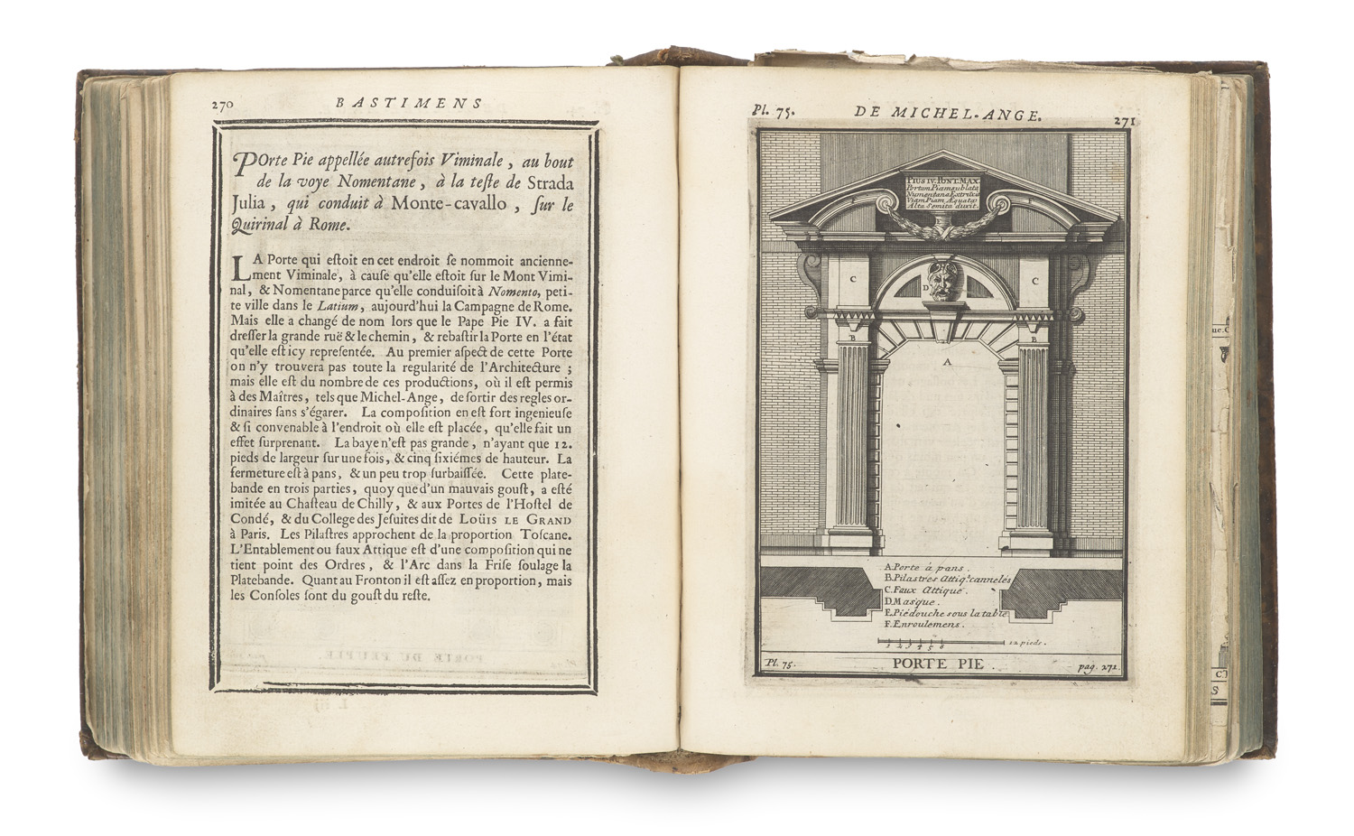 Cours D'Architecture qui comprend Les Ordres De Vignole... Dictionnaire d'Architecture. Paris, Nicolas Langlois, 1693-1696. Mit gestoch. Titel, gestoch. Frontispiz, 28 gefalt. Kupfertafeln, 83 ganzss. Kupferstichen u. 2 gestoch. Vignetten. 40 Bll., XII, 355 S., 3 Bll., 259 S. 8°. Kalbsldr. d. Zt. mit goldgepr. RTitel u. goldgepr. Fileten (beschabt, berieben u. bestoßen).