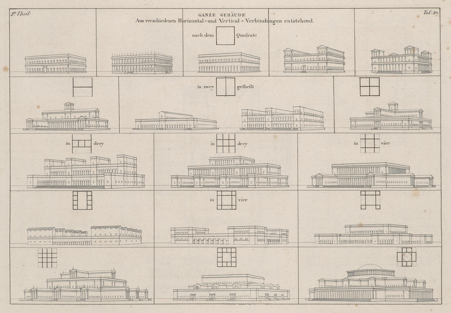Abriß der Vorlesungen über Baukunst gehalten an der königlichen polytechnischen Schule zu Paris. Nach der neuesten Auflage aus dem Französischen übersetzt. 2 Tle. in 1 Bd. und Tafelbd. Mit 64 federlithographischen Tafeln. Karlsruhe und Freiburg, Herder, 1831. 2 Bll., 82 S. 1 Bl., XVI, 49 S., 1 Bl. 4° und Quer-Folio (Tafeln). HLwd. d. Zt. (etwas berieben und bestoßen, Rücken verfärbt).
