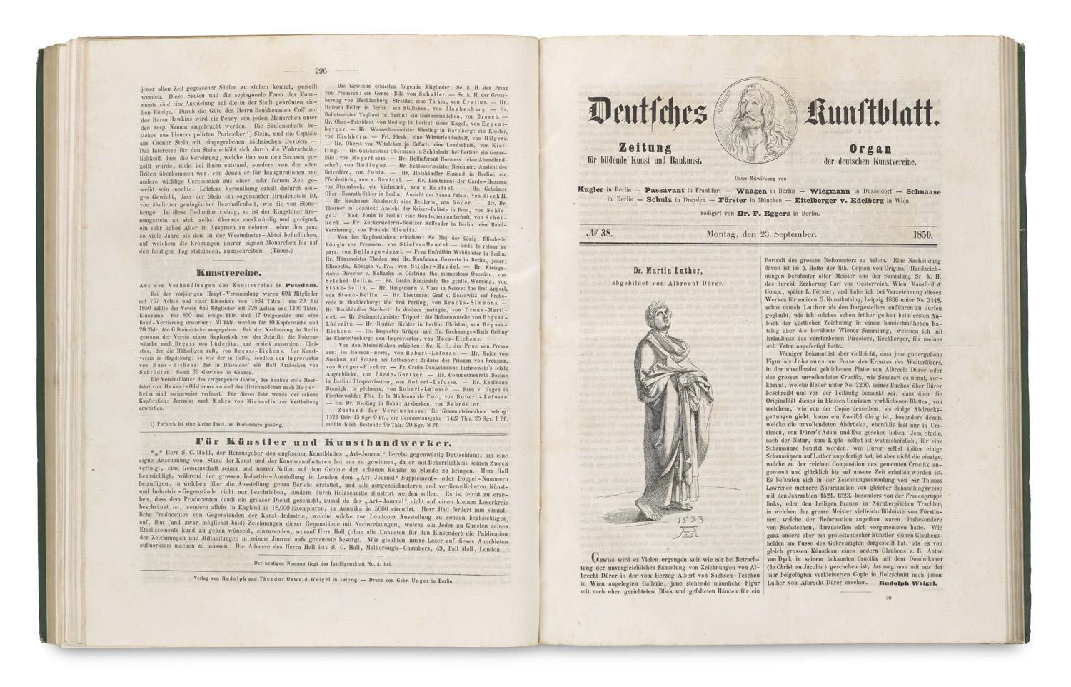 Deutsches Kunstblatt. Erster Jahrgang. Mit mehreren gestoch. o. farblith. Tafeln sowie Illustrationen. Leipzig, Rudolph u. Theodor Oswald Weigel, 1850. VIII, 425 S., 1 Bl. 4°. Pp. d. Zt. mit mont. RSchild (etw. beschabt u. berieben, RSchild mit Fehlstellen, VGelenk oben etw. angeplatzt).