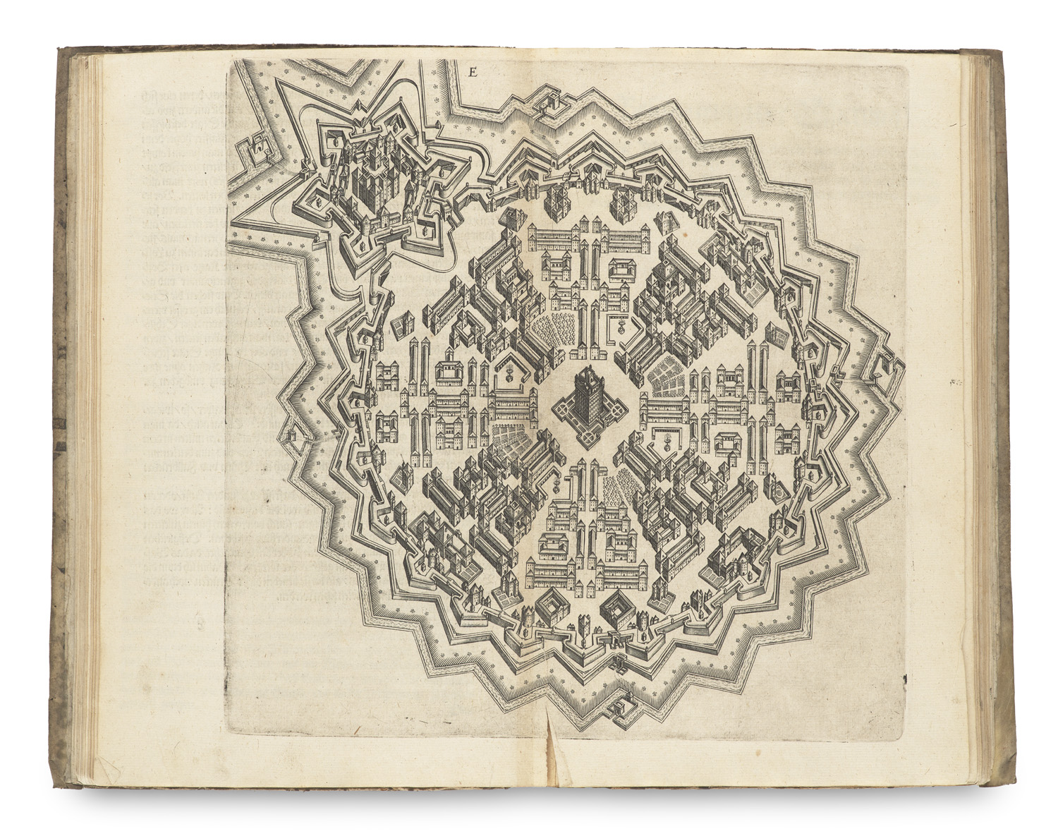 Architektur – Sehr selten, nur ein Exemplar im internationalen Handel für uns nachweisbar. Zweite deutsche Ausgabe nach der ersten von 1602 in Frankfurt. Die französische Erstausgabe erschien 1601 in Paris. - VD17 23:295461F. Brunet IV, 511. Univ. Cat. Books on Art II, 1575. - Beeindruckendes Werk, das sich mit imaginären Festungsanlagen und Stadtplänen befasst. Die außergewöhnlichen Tafeln zeigen surreale anmutende Festungsanlagen und visionäre Entwürfe für Gebäude, so u.a. ein dreizehnstöckiger Bau mit Skulpturen auf dem Dach, Urnen und Brunnen, der an moderne Wolkenkratzer erinnert. - Eine Tafel mit zeitgen. hs. Annotationen. Papierbedingt etwas gebräunt. Vereinzelt leicht fleckig. Insgesamt wohlerhalten. Selten.