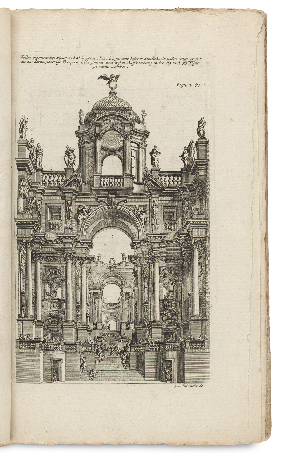 Der Mahler und Baumeister Perspectiv, worinnen gezeiget wird, wie man auf das allergeschwindeste und leichteste alles, was zur Architektur und Baukunst gehöret, ins Perspectiv bringen solle. Inventiert, gezeichnet und heraus gegeben in Rom. Erster Theil (von 2). Mit gest. Portrait u. Frontispiz und 102 Kupfertafeln (davon 100 numm.). Augsburg, Bürglen, 1800. 1 Bl., 44 S. Folio. Pp. d. Zt. (berieben und bestoßen, Rücken fehlend).