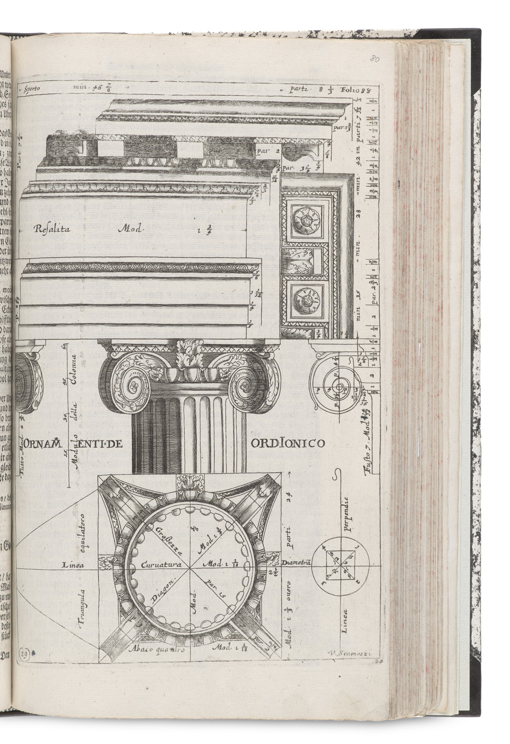 Architektur – Fowler 298. Ornamentstichkat. Berlin 2606 (gibt nur 83 Kupfer an). VD17 3 308023K. - Erste deutsche Ausgabe. Das Werk des großen Baumeisters Scamozzi (1552-1616), dessen Theorie noch in der italienischen Renaissance wurzelt, wurde zum Grundlagenwerk vieler Architektengenerationen. Das Titelkupfer dieser deutschen Übersetzung, gestochen von Sigmund Gabriel Hipschmann stammt aus der in Venedig erschienenen Erstausgabe von 1615. Die Kupfer zeigen Säulenordnungen, Portale, Paläste, Fassaden, Mauern u. Grundrissen. - Titelseite und wenige Bll. fachmännisch restauriert, sonst gutes und sauberes Exemplar des wichtigen Werkes.