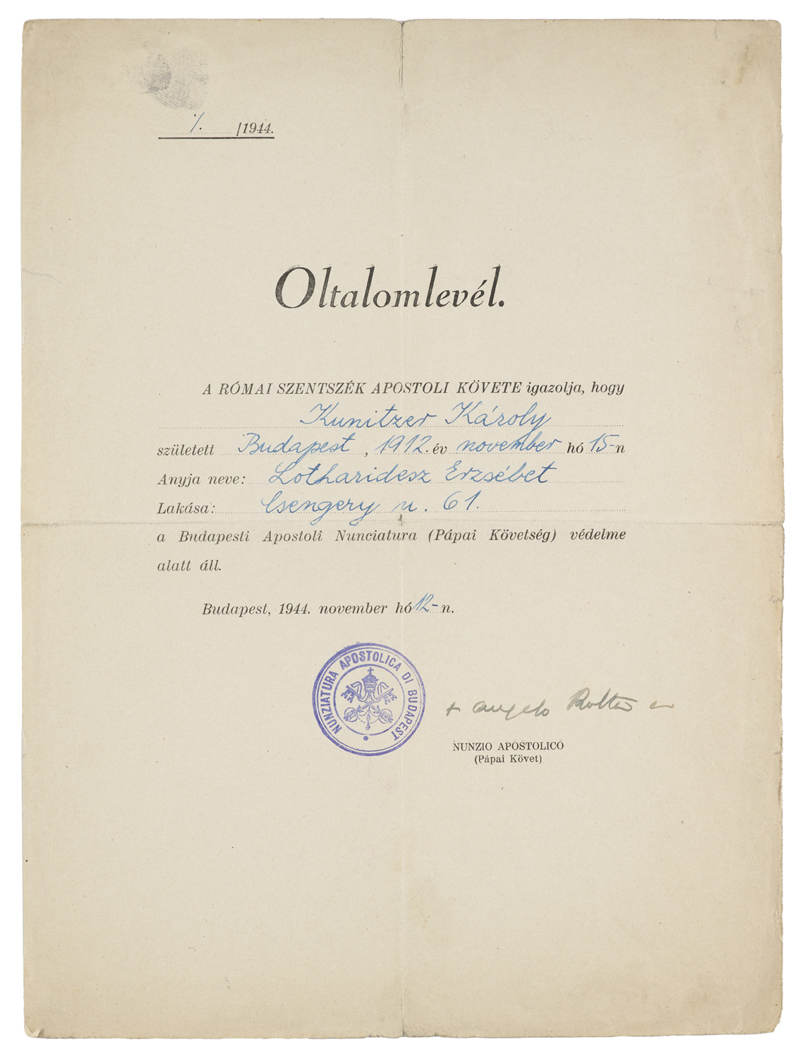 Schutzbrief ("Oltalomlevel"), ausgestellt für einen ungarischen Juden und unterzeichnet vom Apostolischen Nuntius in Budapest, Monsignore Angelo Rotta. 31,5 x 23,3 cm.