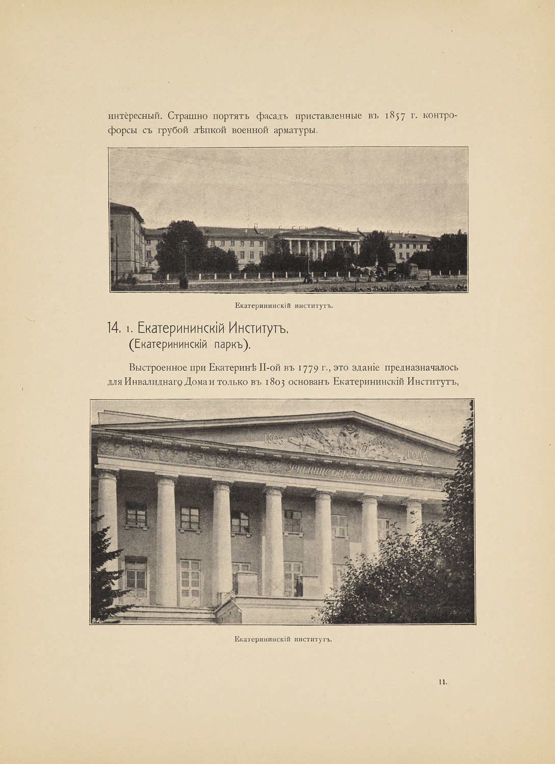 Science of Art – With 36 collotype plates, including 51 photographic illustrations and 7 further photographic text illustrations. - Comprehensive work on the architecture of 18th and early 19th century Moscow Classicism, edited by reknown town planner Ilya Bondarenko, present is part 1 (of 3), which covers the era of Tsar Alexander I (1801-25). Parts 2 and 3 (published in 1906) deal with the eras of Peter I (1682-1721), Elizabeth (1741-62) and Catherine II (1762-96) and contain a further 72 collotype plates. - The plates from the office of K. A. Fischer, one of the most prominent photographers in Russia at the time, show churches, monuments (the triumphal arch on Tverskaya Zastava), administrative and civil buildings (university), the Kuzminiki estate, parks (Alexander Garden), the ring as well as interiors. - Title page heavily time-stained and somewhat foxed, quires of text sheets loose, plates slightly browned at margins. Overall clean portfolio with sharp, high-contrast collotypes of the imposing architectural monuments.- Rare, no other copy available outside of Russia.