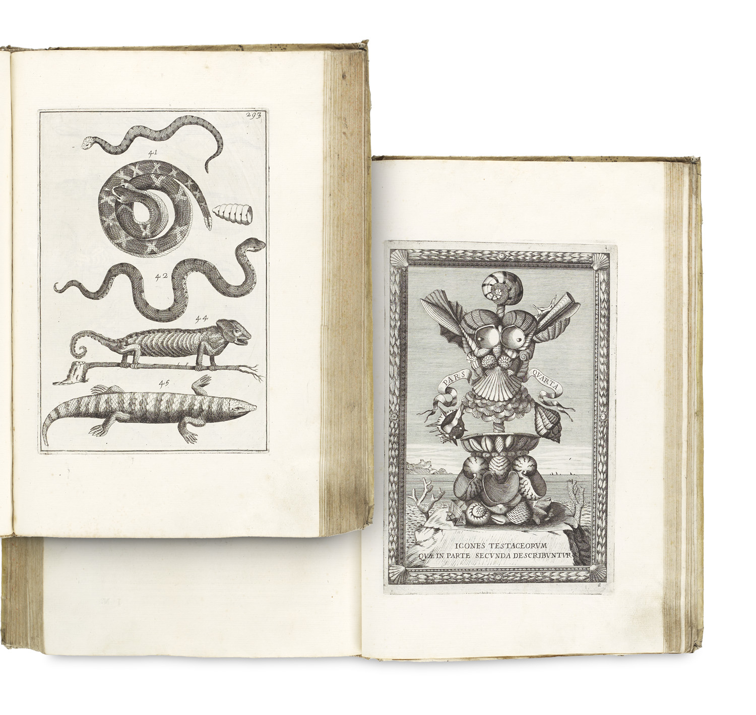 Kunstwissenschaften – Katalog der von Athanasius Kircher im Jesuitenkolleg in Rom betreuten Antiken- und Naturaliensammlung. - Nissen ZBI 2198. - Wellcome II, 271. - De Backer/S. II, 381,9. - Diese bestand zum einen aus der grossen Sammlung Kirchers sowie der Schenkung des italienischen Aristokraten Alfonso Donnini. Basis der Sammlung waren das ethnographische Material, die wissenschaftlichen Geräte und die Kuriositaten, die von den Jesuiten in der ganzen Welt zusammengetragen wurden. Die 48 Taf. am Schluss (dabei vier schöne Kupfertitel bzw. Zwischentitel) stellen Muscheln dar und sind teilw. dem Buch von Buonanni Ricreatione dell'occhio... nell' osservatione delle Chicciole, 1681, nachgestochen. Das Porträt von Prinz Ruspoli nicht als Frontispiz sondern nach Titelbl. eingebunden. - Notizen auf Innendeckel, leere Rücks. von Titel u. Porträt fleckig, 1. Indexbl. mit größ. Einriß, insgesamt gutes, sauberes Exemplar.