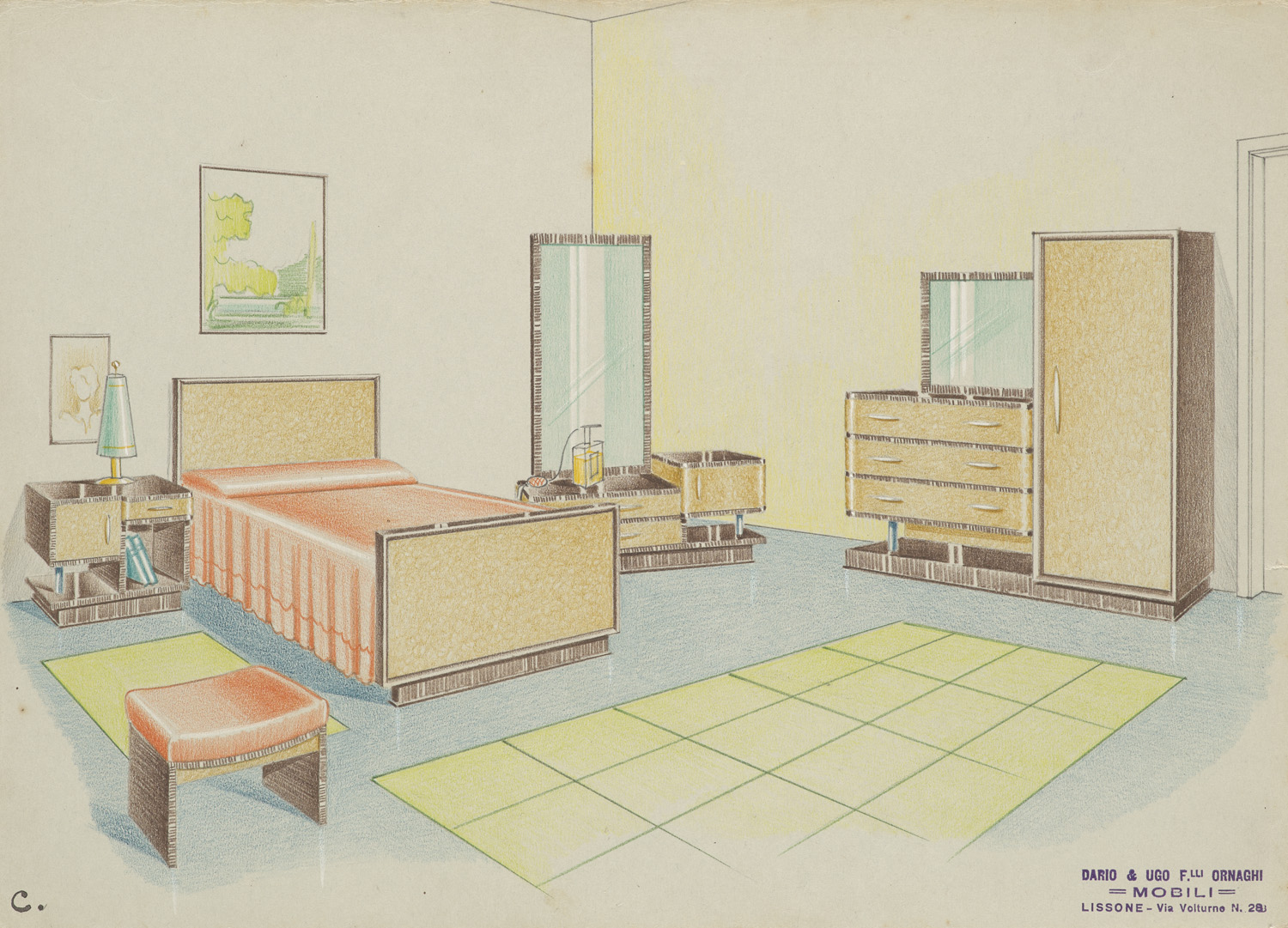 Archiv der Gebrüder Dario und Ugo Ornaghi (Ditta Dario e Ugo Fratelli Ornaghi). Umfassende Sammlung von 96 Originalentwürfen für Möbel und Inneneinrichtungen sowie 62 Original-Photographien. Lissone (Mailand), erste Hälfte des 20. Jh. Mit 66 farbigen Buntstift- sowie 30 Bleistiftzeichnungen, auf versch. Papier, darunter leichter, gräulicher Karton, leichtes Velin (mit Wz. "EXTRA STRONG"), Transparentpapier u.a. Blattmaße überwiegend ca. 25 x 35 cm, teils mehrfach gefaltet. Die Originalphotographien je Silbergelatineabzüge, je ca. 20 x 28 cm, 1 Abzug 29 x 39 cm. Recto und verso überwiegend mit dem Stempel der Fratelli Ornaghi, sowie teils gestempelt "Arch. G. Rancati" oder "Fratelli Pironi". - Meist lose unter Passepartout eingelegt oder gesteckt, überwiegend eingelegt in moderne HLeinenkassetten.