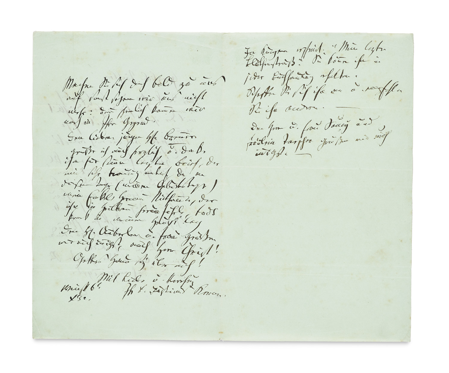 Autographs – Handwritten and signed letter from the physician and poet Justinius Kerner. Folded double page. - Letter from Justinius Kerner to acquaintances in Basel, in which he reports his illnesses and thanks them for their hospitality. He also mentions his works "Seherin von Prevost" and "Der letzte Blüthenstrauß," the latter still unpublished at the time. He also sends greetings to other Basel friends, such as Mr. and Mrs. Auberlen. - Slightly stained. Overall, very well preserved.