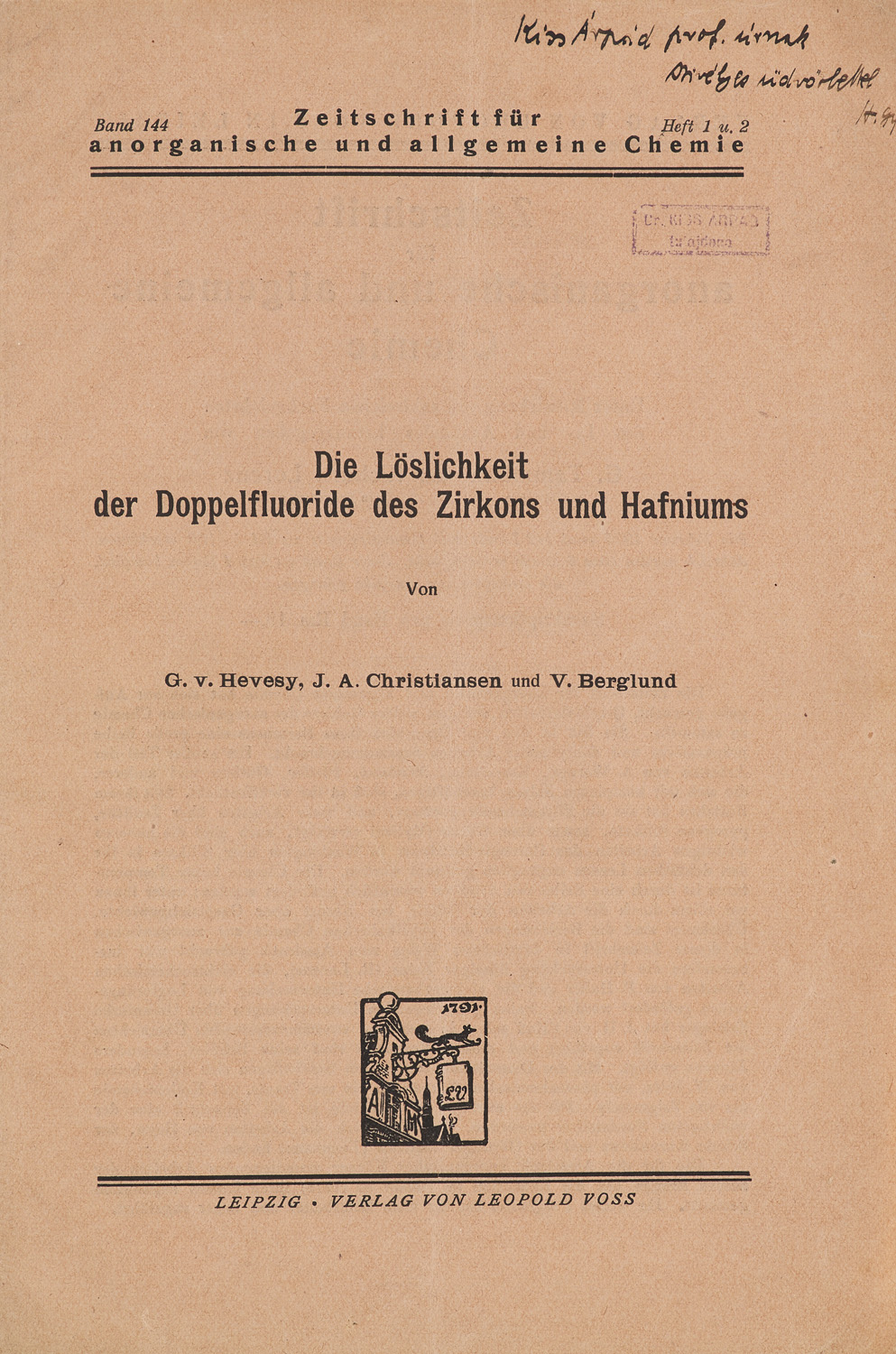 Natural Sciences – Offprint of "Zeitschrift für anorganische und allgemeine Chemie". Band 144. Heft 1 u. 2. Original Booklet. (Edges slightly browned.) - With Kiss' stamp of ownership. In original paper. Inscribed by Hevesy to Árpád Kiss chemist and the author of the first work in Hungarian on radioactivity in 1911. - Research on the solubility of double-fluoride of zirconium and hafnium in water at various temperatures by Georg von Hevesy (1885-1966) radiochemist, Nobel laureate, disciple and friend of Ernest Rutherford, the co-discoverer with Dirk Coster of Hafnium (named after Hafnia, the Latin name of Copenhagen, Niels Bohr's - Hevesy's friend - home town). He earned the Nobel Prize in Chemistry in 1943 "for his work on the use of isotopes as tracers in the study of chemical processes". He was member (beside numerous scientific associations) of The Royal Society of London and gained its highest award, the Copley Medal. - Included: Hevesy, Georg. v - Pahl, Max. - Hoseman, Rolf. Radioactivity of Potassium by Prof --. Institute of Physical Chemistry, University of Freiburg/Br. (Reprinted from Nature, Vol. 134, page 377, September 8, 1934. - In fine condition.