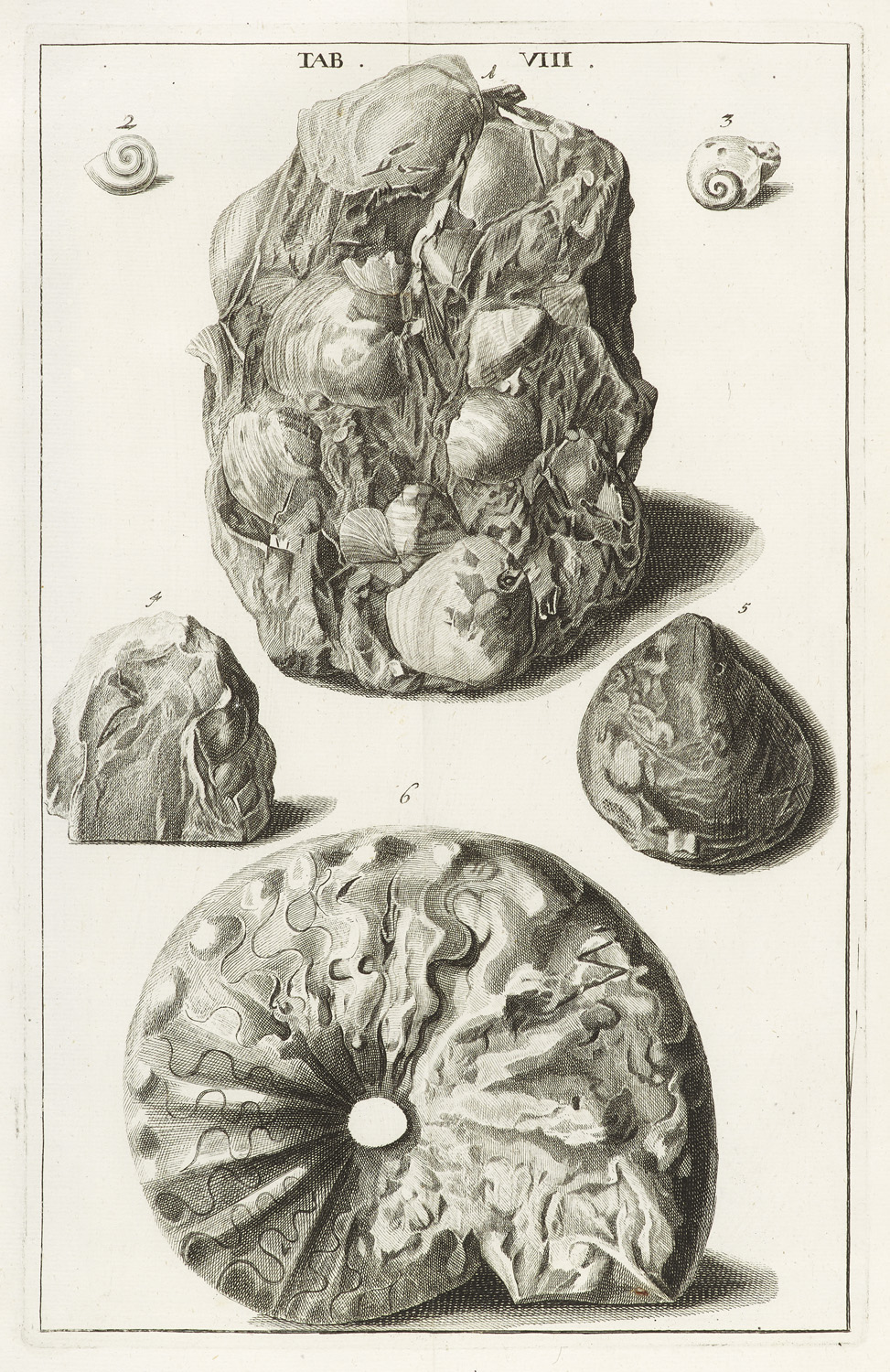 Historiae naturalis Hassiae inferioris. Pars prima. ... i. e. Der Natur-Geschichte des Nieder-Fürstenthums Hessen erster Theil (alles Erschienene) worinnen dessen vornehmste und zierlichste ... Fossilia ... an des Tages Licht hervor gebracht werden ... Mit gestoch. Frontispiz und 25 Kupfertafeln von C. W. Eberlin, I. N. Prizier und I. A. Corvinus, alle gestochen von Corvinus. Kassel, Harmes 1719. 6 nn. Bll., S. 14-52. Folio.Pgt. d. Zt. (etw. fleckig u. bestossen, ehemals beigebd. Werk durch leere Bll. ersetzt).