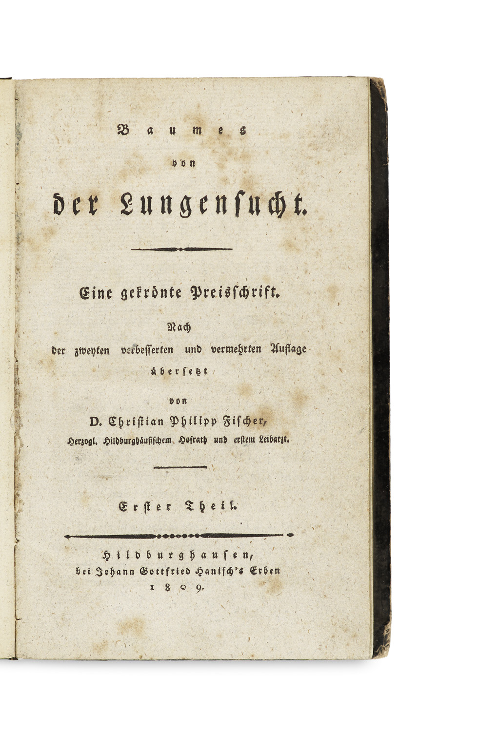 Baumes von der Lungensucht. Eine gekrönte Preisschrift. Nach der zweyten und vermehrten Aufl. übers. von D. Christian Philipp Fischer. 2 Teile in 1 Bd. Hildburghausen, Hanisch, 1809. 350, 252, V S. Pp. d. Zt. mit RSchd. (etwas beschabt).