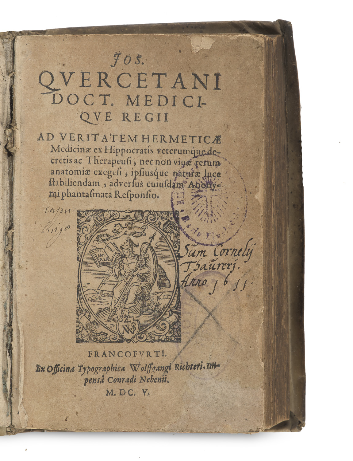 Naturwissenschaften – Selten. - VD17 39:116425M - Mit zwei Bibliotheksstempeln. - Werk des französischen Alchemisten und Mediziners Joseph Duchesne. Er war zeitweise der Leibarzt von Heinrich IV und ab 1604 am Hof von Landgraf Moritz von Hessen-Kassel. - Angebunden: Tetras Gravissimorum Totius Capitis Affectuum. Marburg, Paul Egenolff, 1606. 12 Bll. 488 S., 6 Bll. - Letzte Seite des angebundenen Teils ausgerissen. Ränder gebräunt, fleckig, zweites Titelblatt mit hs. Anmerkung. Ingesamt gut erhalten.